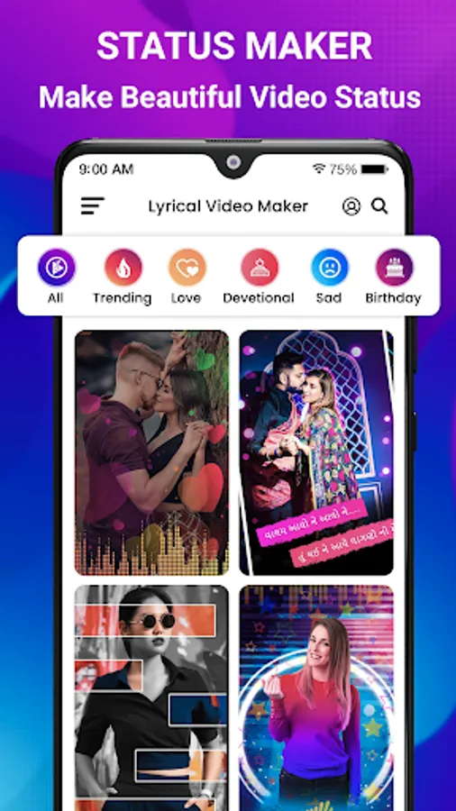 lyrical photo video maker have a great collection of song lyrics select your favorite lyrics and add them on your pictures and make lyrical videos of your own pictures and share your feelings with your love using your photo lyrical video.