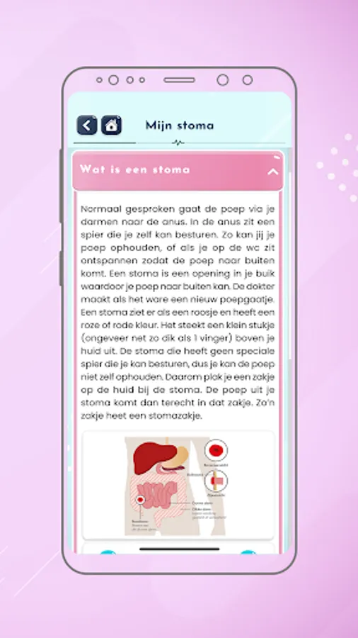 Information: first of all, the app offers texts, images and videos about getting a stoma and about caring for and dealing with a stoma. The texts are adapted to the age that the child enters when registering, so that the child always learns about his or her stoma in understandable language. The lyrics are also recorded and can always be listened to.