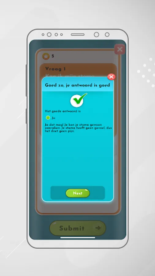 Milestones: Through milestones that are released based on the entered surgery date and push notifications, children are guided through the process of getting a stoma and recovery afterwards. Milestones can be ticked off when they have been achieved, for this you get points that you can spend in the StoMakker game.