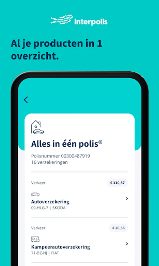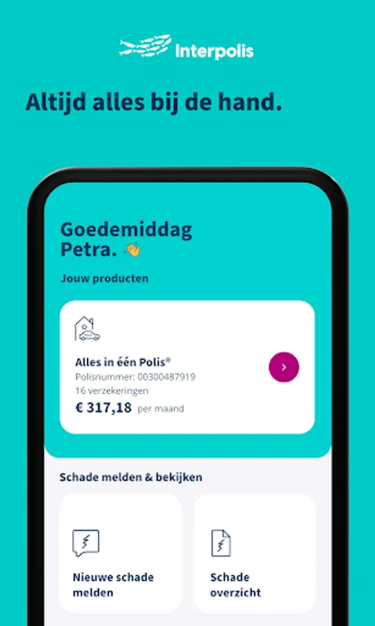 • Personal and handy: your insurance policies on the Interpolis All-in-One Policy® in a handy overview. In this way you can always check your insurance policies, coverage and conditions.