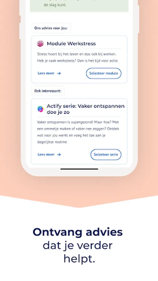 You can also get started with questions about exercise and questions about mental health. You answer a number of questions and you immediately receive advice.