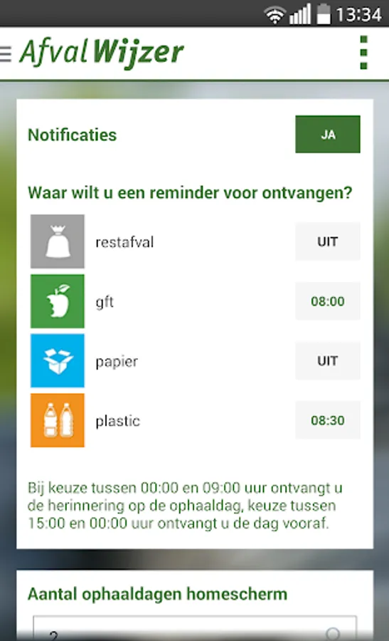 If you use notifications you have the choice of the evening before, or the morning of the collection day. This notification is sent around 7 o'clock in the evening or around 7 o'clock in the morning.