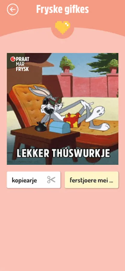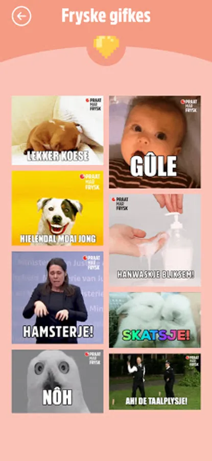 In addition, with the Lear mar Frysk function in the app you can test your knowledge of the Frisian language in a fun way and at the same time brush up on your Frisian. Do you want to give your messages extra power? Then try the Praat mar Frysk gifs! Laugh!