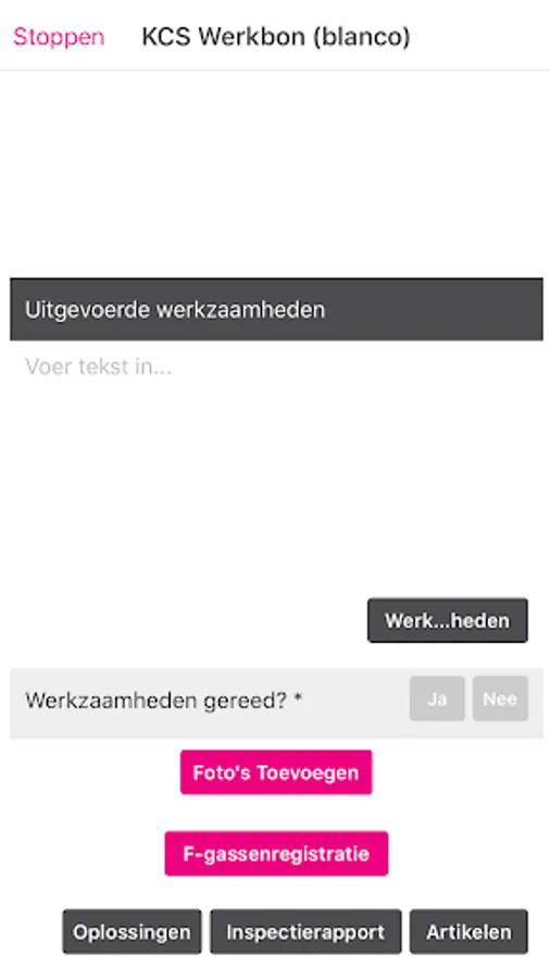 Opdrachten worden vanaf kantoor verstuurd naar uw medewerkers in het veld. Deze opdrachten komen in de app te staan met alle informatie die daarop betrekking heeft. Medewerkers met de app starten de opdracht en kunnen hier o.a. navigeren naar het bestemmingsadres, kilometerstanden bijhouden, een werkomschrijving opgeven, artikelen toevoegen, het invullen van op maat gemaakte inspectierapporten of afvinklijsten, het maken van foto's en nog veel meer. Via digitale ondertekening laat u uw klant op locatie de werkopdracht ondertekenen op een tablet of telefoon. De werkopdracht kan optioneel direct naar uw klant gemaild worden. Kantoor ontvangt na ondertekening direct de werkopdracht, de bijbehorende foto’s en het inspectierapport. De factuur kan direct worden gemaild naar uw klant.