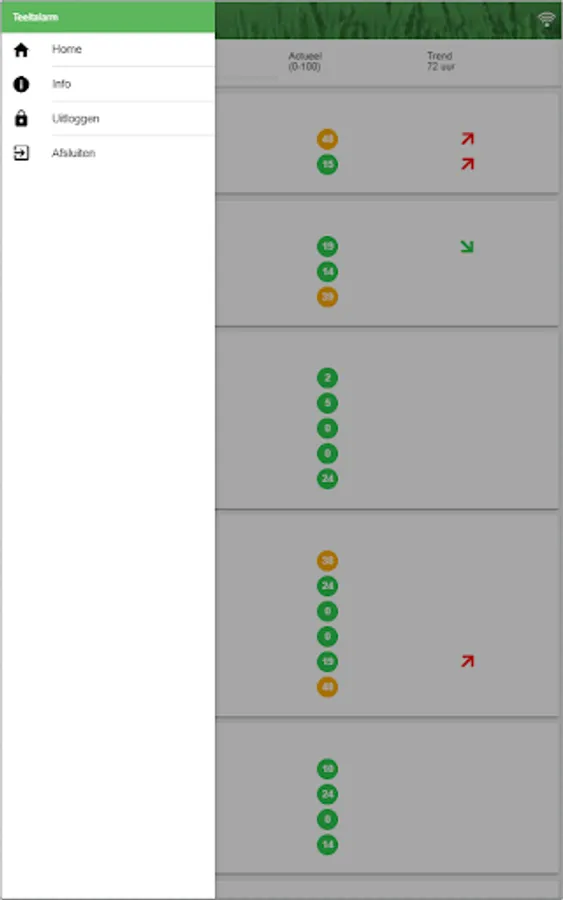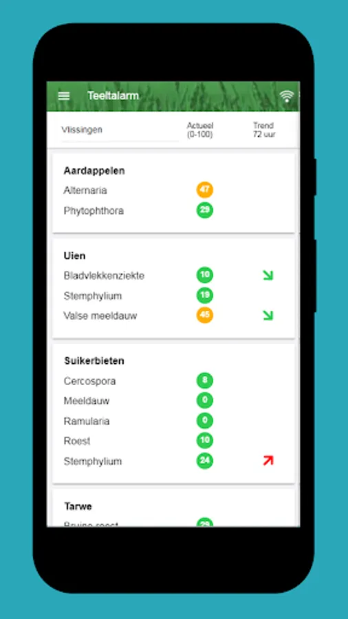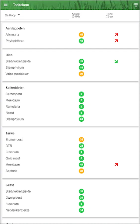 The Growing Alarm app provides insight into the pathogen of major crops in your area. By region, the current burden of disease and the trend for the next few days show based on measurements and weather forecast. Harvesting with certainty!