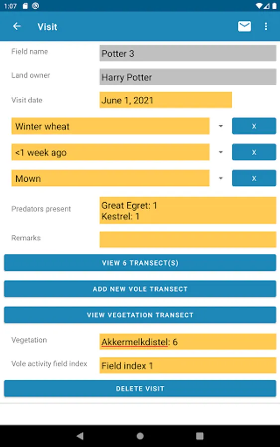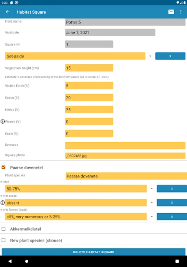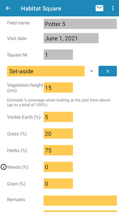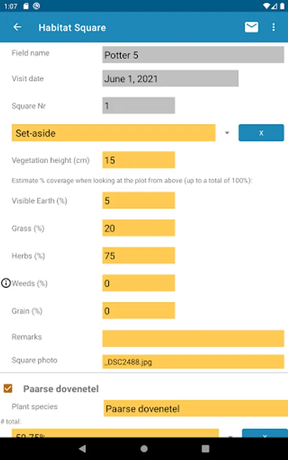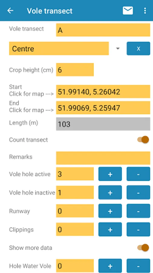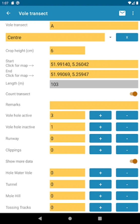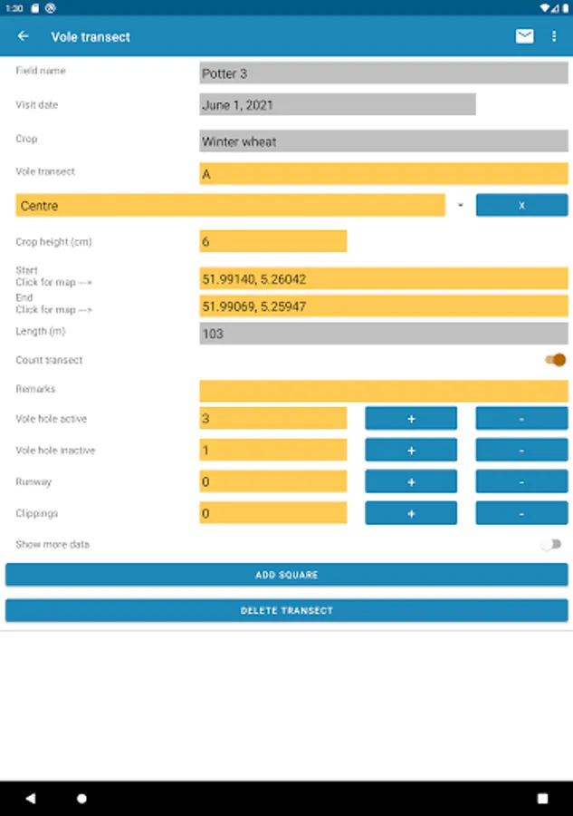 Field Monitor is an easy way to collect ecological data on vole abundance, vegetation structure and plant species composition on farmland, parameters that are important to both farmland birds and their researchers. During transect counts Field Monitor automatically tracks the distance covered. In addition, Field Monitor also enables you to monitor voles and vegetation per square meter. Registered data can subsequently be exported to your email address at any desired time.