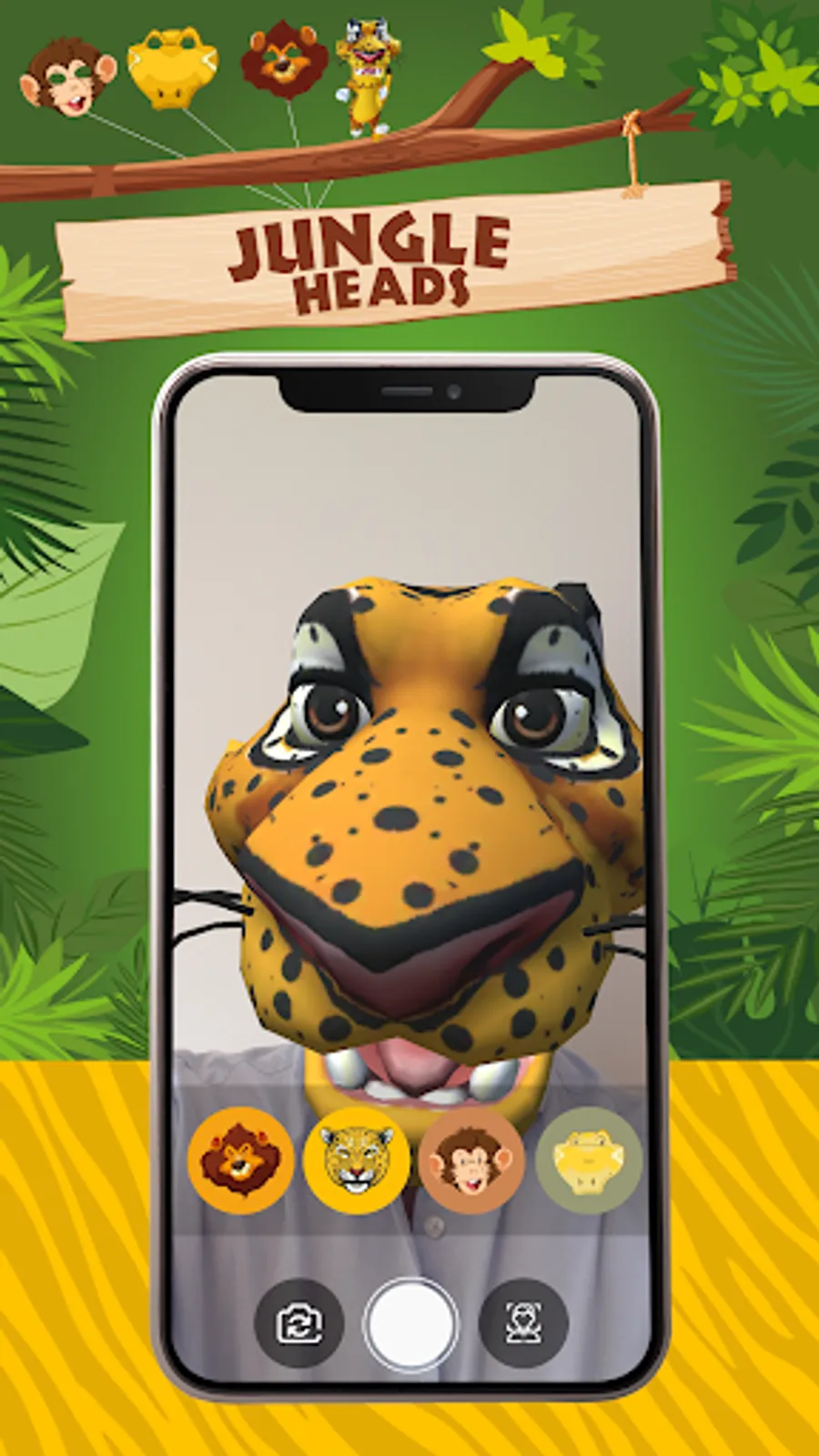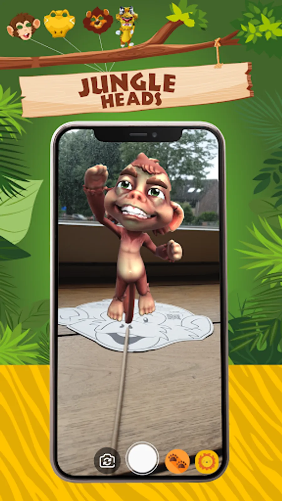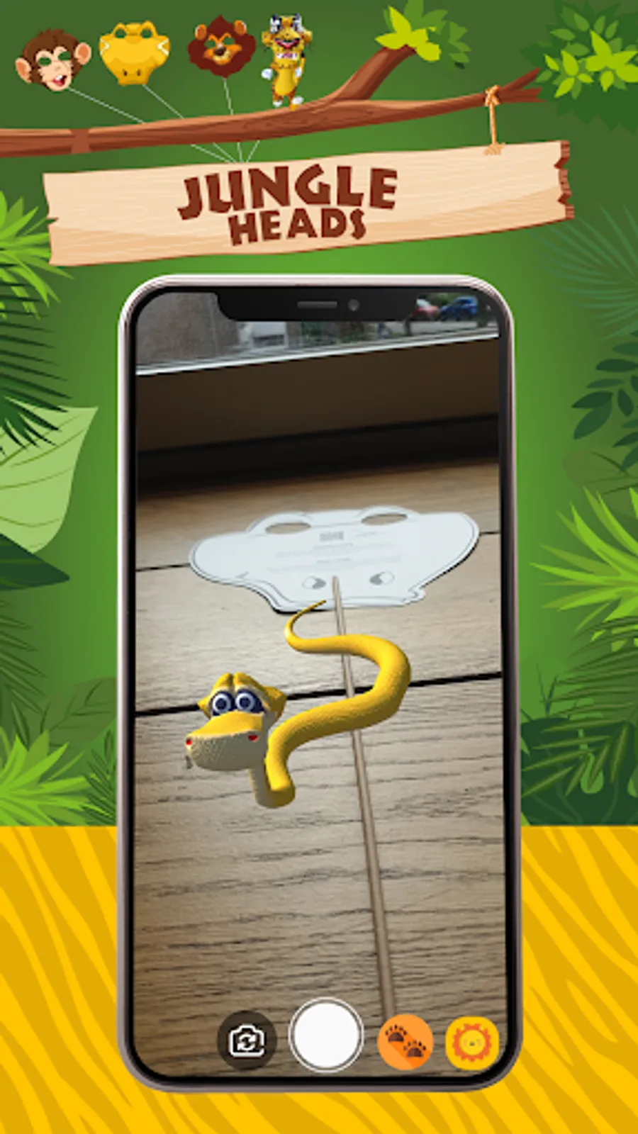 · Open the camera in the 'Jungle Heads' app and aim the camera toward the mask.