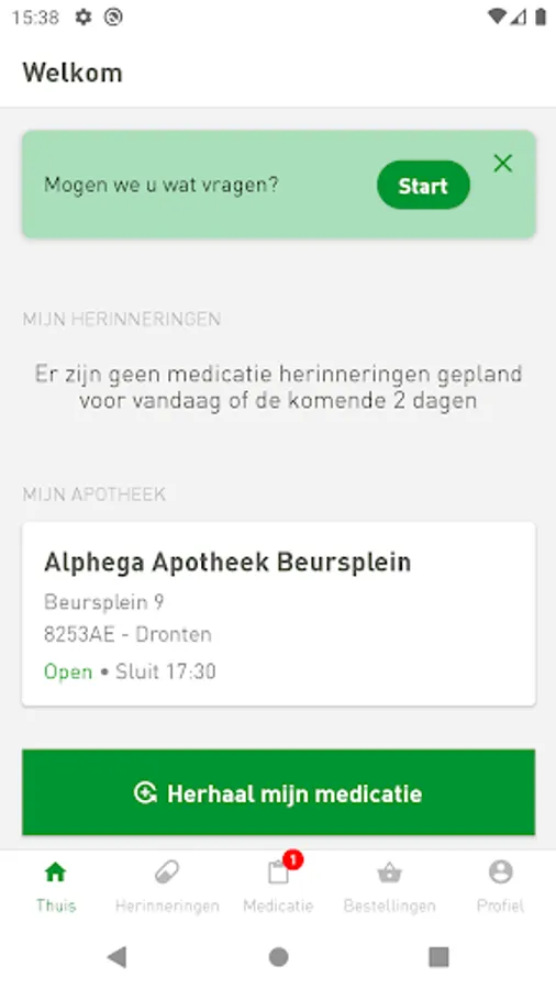 The Alphega pharmacy app offers you the convenience of viewing information about the medication delivered to you, when it suits you. You can set reminders via the medicine alarm to never forget an intake. You can also easily place a repeat order at your pharmacy at any time.