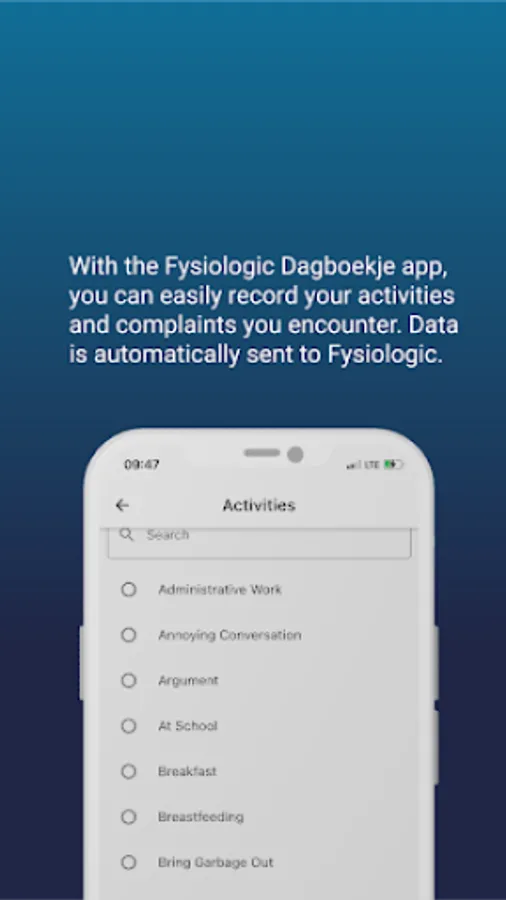 You have been given an ECG Recorder (Holter) to record your heart rhythm. You are also asked to record your activities and complaints in a diary. With the Physiologic App you can easily keep track of your diary. All you have to do is tap the activity and complaint(s) that are bothering you. The Physiologic App fills in the date and time itself.