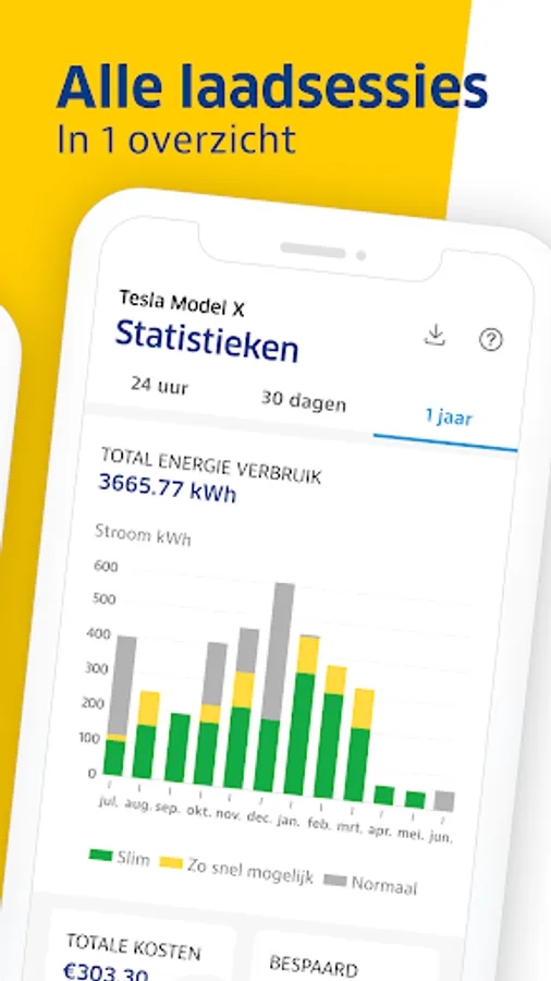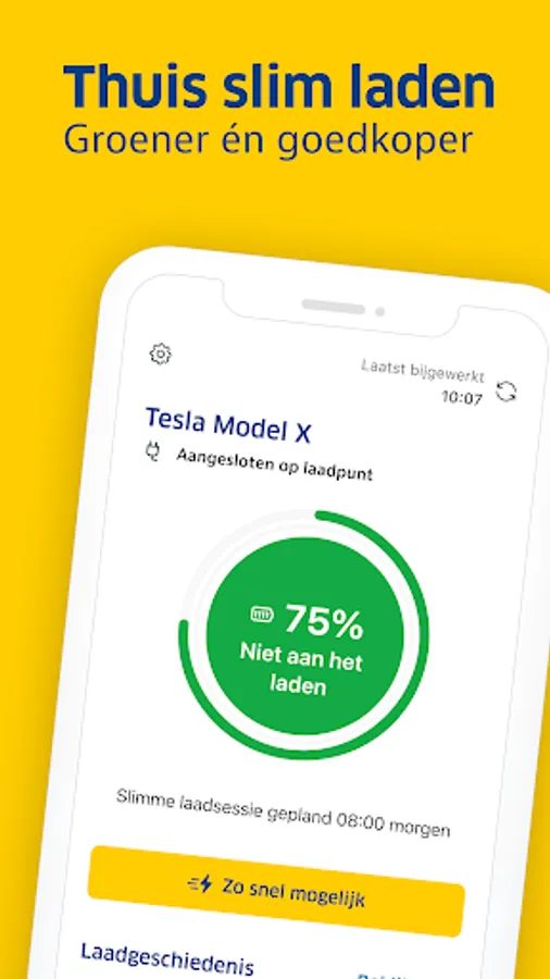Think of smart charging as driving outside rush hours. If there is a lot of demand for power, the app pauses charging and only continues when there is a lot of supply from solar and/or wind and less demand. This way we prevent traffic jams and accidents on our energy network.