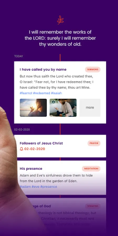Devoted provides you with all the tools you need to create entries regarding prayer, proclamation, diary, dreams, meditations, blessings, books, sermons and prophecies. Add notes, pictures and voice recordings and check back on them as often as you like. Search by category or scroll though the timeline to find exactly what you are looking for.