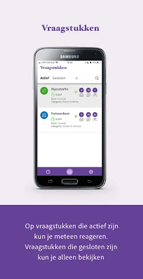Here you will find all the issues that are important to you. You can immediately see how many opinions have been given and how many other people are participating in the issue. When an issue is active, you can respond. If a question has no active dialogues, you will find it under the closed questions. You can simply view and read all information, even if the issue is closed. An issue can become active again at any time when a new dialogue is launched. The issue will then automatically appear with your active issues.