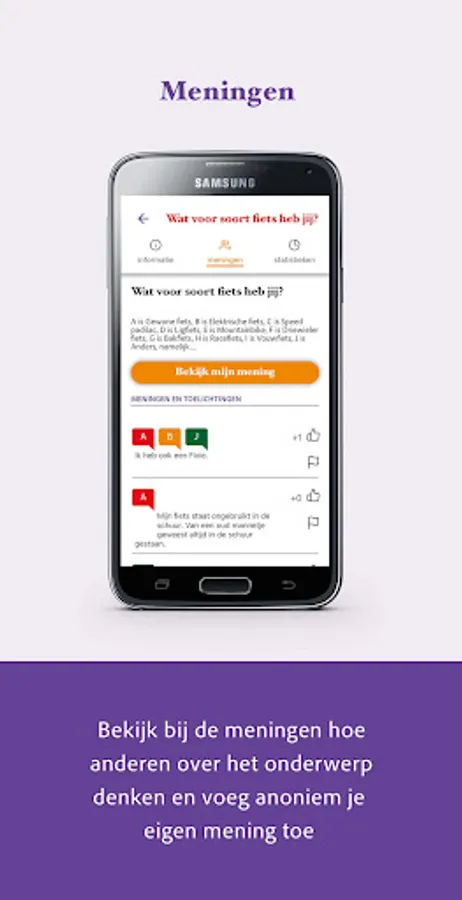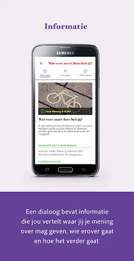 Each question contains at least 1 or more dialogues. A dialogue is an open question, a multiple choice question, an emotional question or a mood. You may provide an explanation of your answer for all questions. The dialogue includes an 'information' tab in which, among other things, the subject of the question, who actually decides about it and what happens after this dialogue? In the 'opinions' tab you can see what others think about it and you can give your own opinion. You can also supplement the opinion of others here if you agree with them. In the 'statistics' tab you can see the results and the composition of the group in tables.