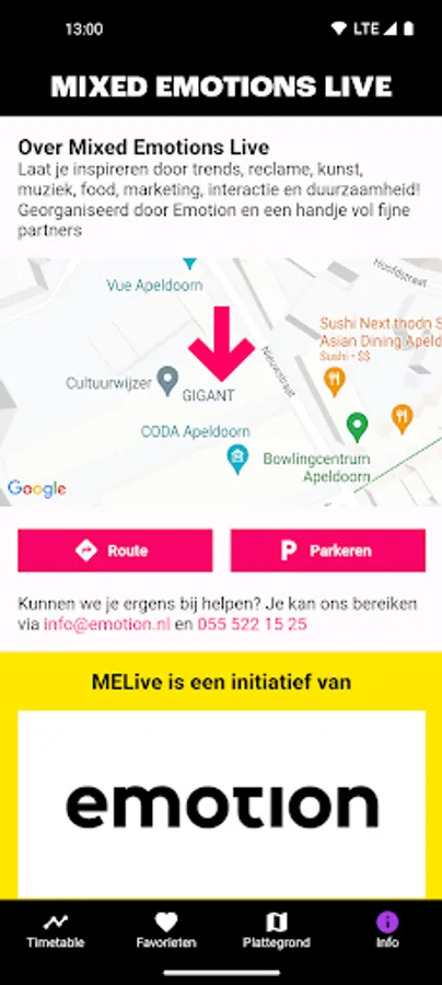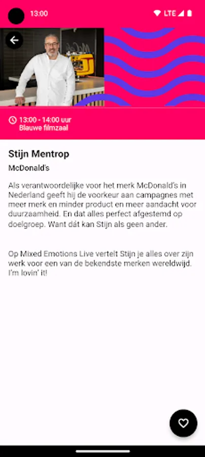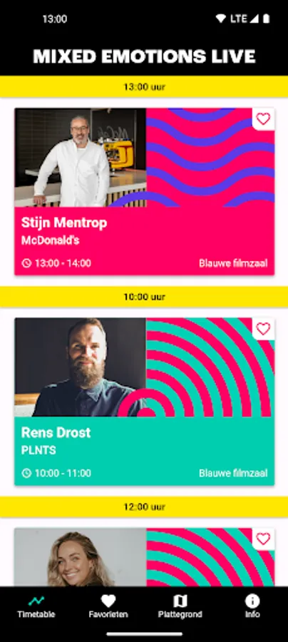 Don't miss anything from your favorite speakers with the Mixed Emotions Live app. See in one overview where and at what time all speakers will speak and create your own timetable by marking speakers as favorites. You will then receive a notification fifteen minutes before your favorite talk that your speaker is about to start. Super handy, because you don't want to miss your favorite speaker!