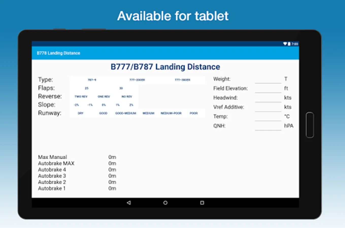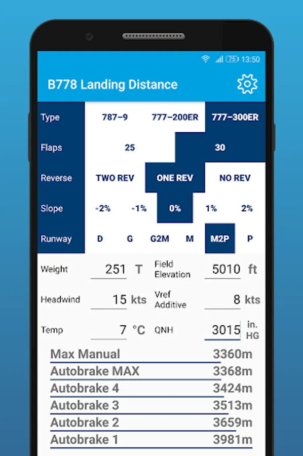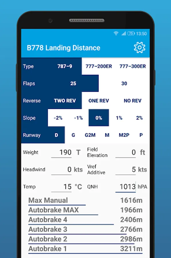 Calculate the normal configuration landing distance for a Boeing 777-200/300 and Boeing 787-9. Always check calculations made in this app with the documents provided by your company!