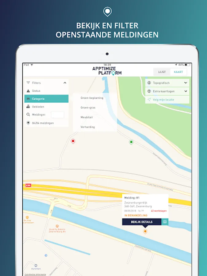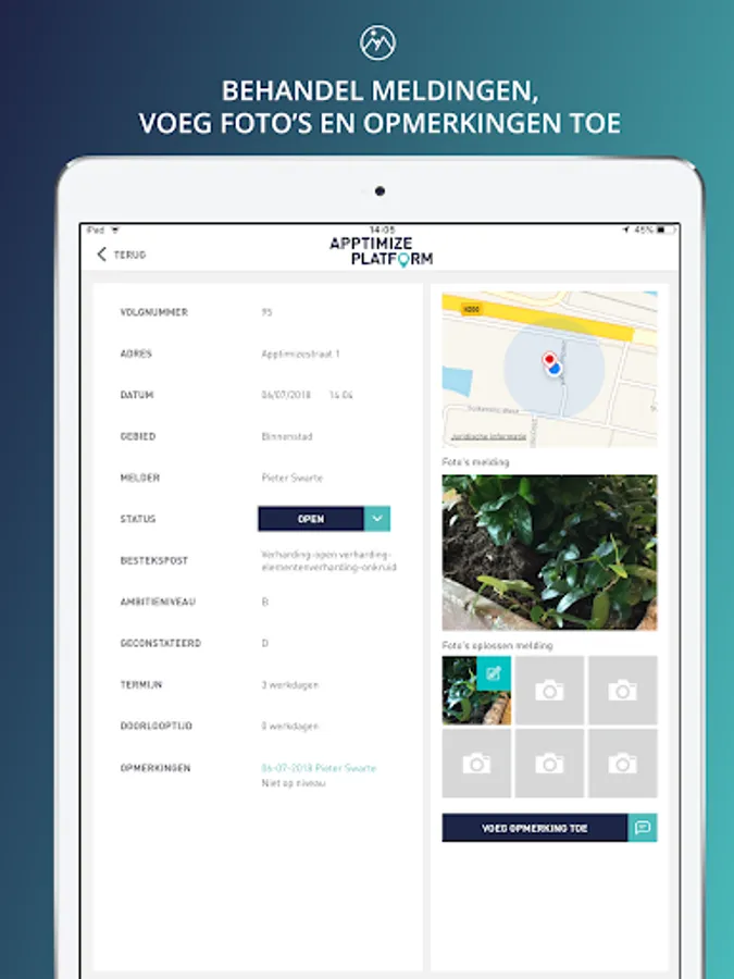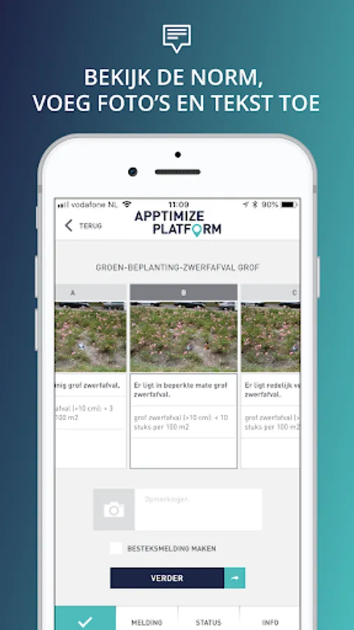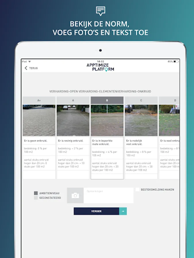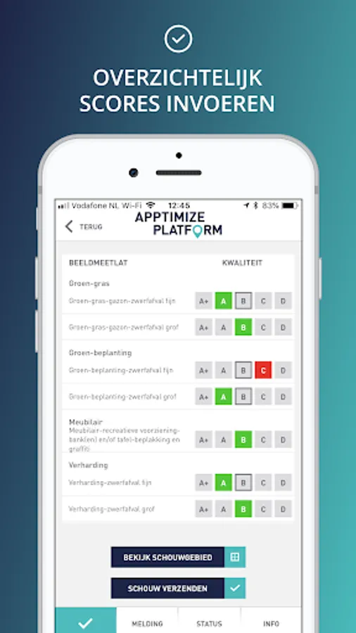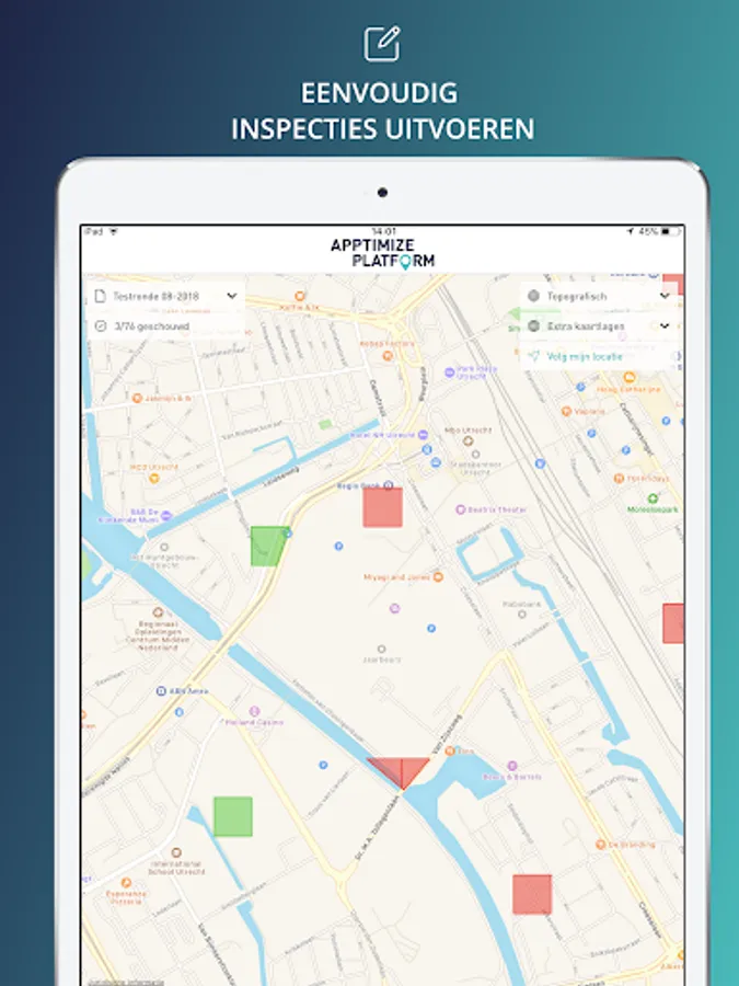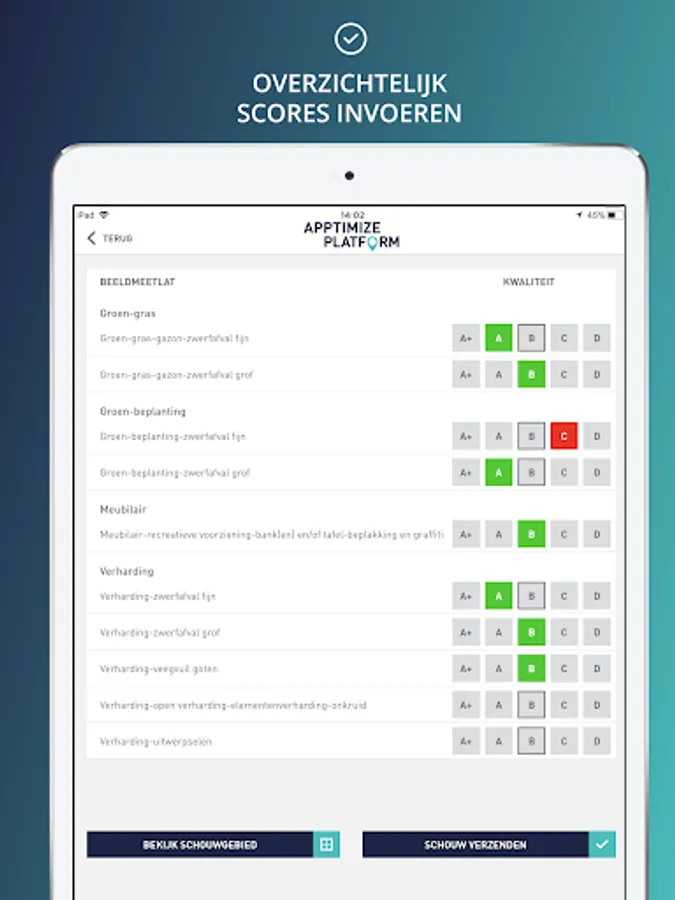 Dozens of managers and contractors are already making full use of the Apptimize Platform, a complete and user-friendly application for smartphone, tablet and desktop. Within a few steps you can make a specification report or carry out a check (based on the CROW system). These results can be viewed directly within the office application. The quality of your area is always clear and you can immediately adjust to meet performance requirements. This way you gain more insight in less time.