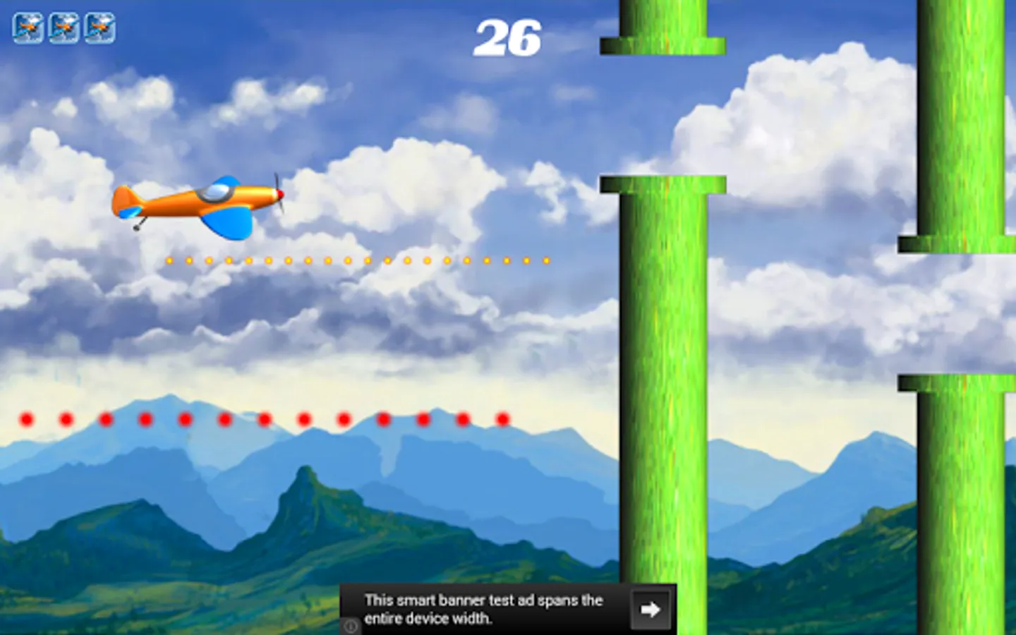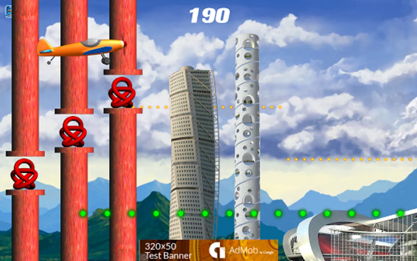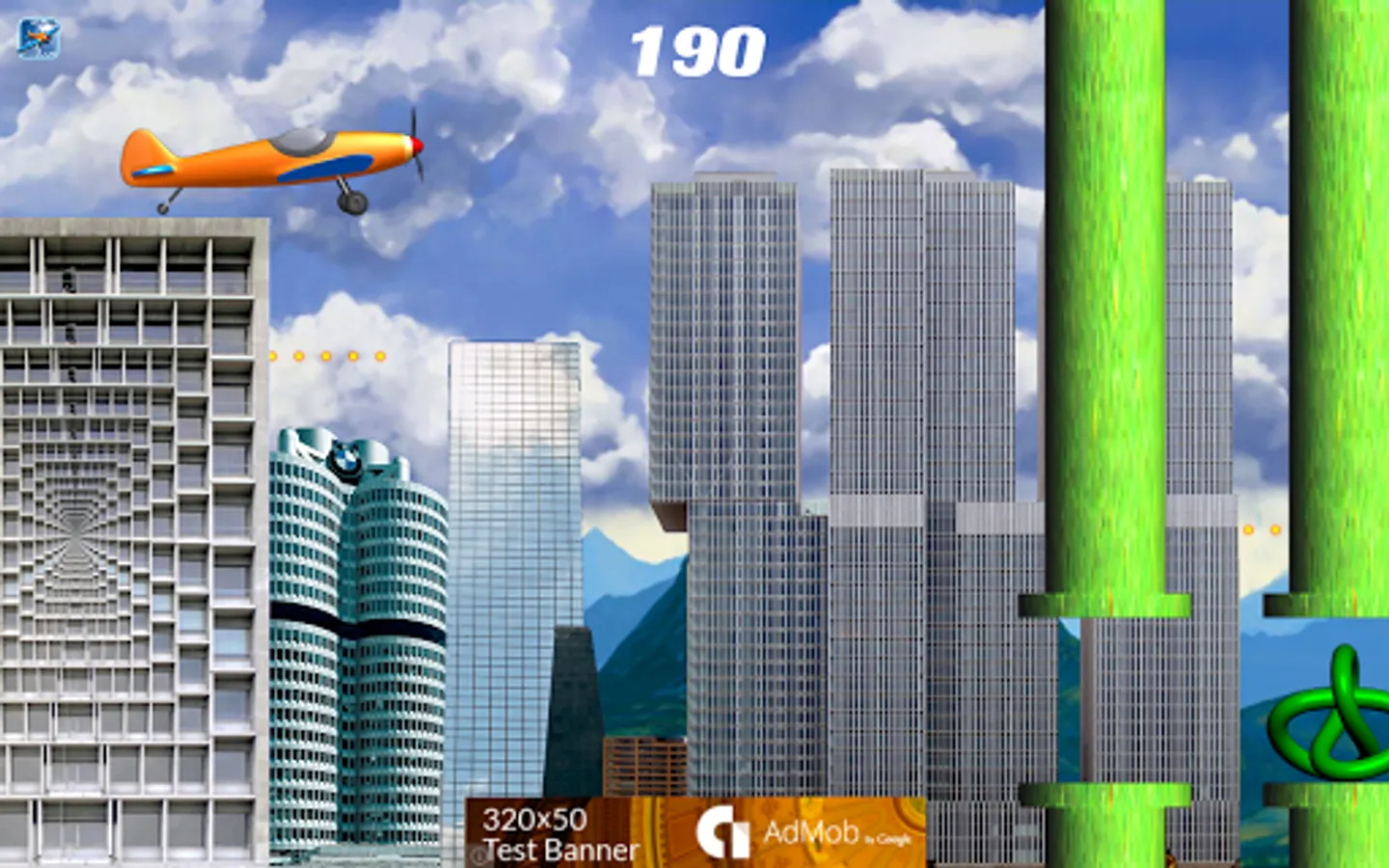 Guide your airplane with it's flappy wings through this scenery and try to get as many dots from the air as possible. Earn extra points by hitting the torus between the pipes. And, please don't hit any buildings!!