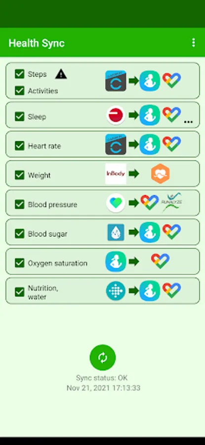 Sync your health data from Coros, Diabetes:M, FatSecret (nutrition data), Fitbit, Garmin, Google Fit, MedM Health, Withings, Oura, Polar, Samsung Health, Strava, Suunto and Huawei Health. You can sync to Diabetes:M, Fitbit, Google Fit, Health Connect, Samsung Health, Schrittmeister, FatSecret (weight only), Runalyze, Smashrun, Strava or Under Armour (MapMyRun etc.). Activity data can also be synced as FIT, TCX or GPX file to Google Drive. Health Sync works automatically and syncs the data in the background.