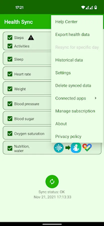 Syncing between health data apps sometimes doesn't work as expected. Don't worry, almost all issues can be solved easily. You can check the Help Center menu in Health Sync. And if you can't solve the issue, you can send a Health Sync problem report (the last option in the Help Center menu), or send an email to info@appyhapps.nl You will get support to solve the sync issue.
