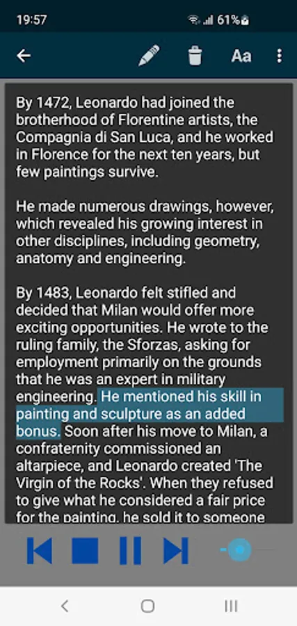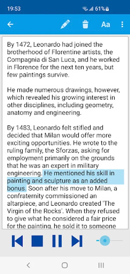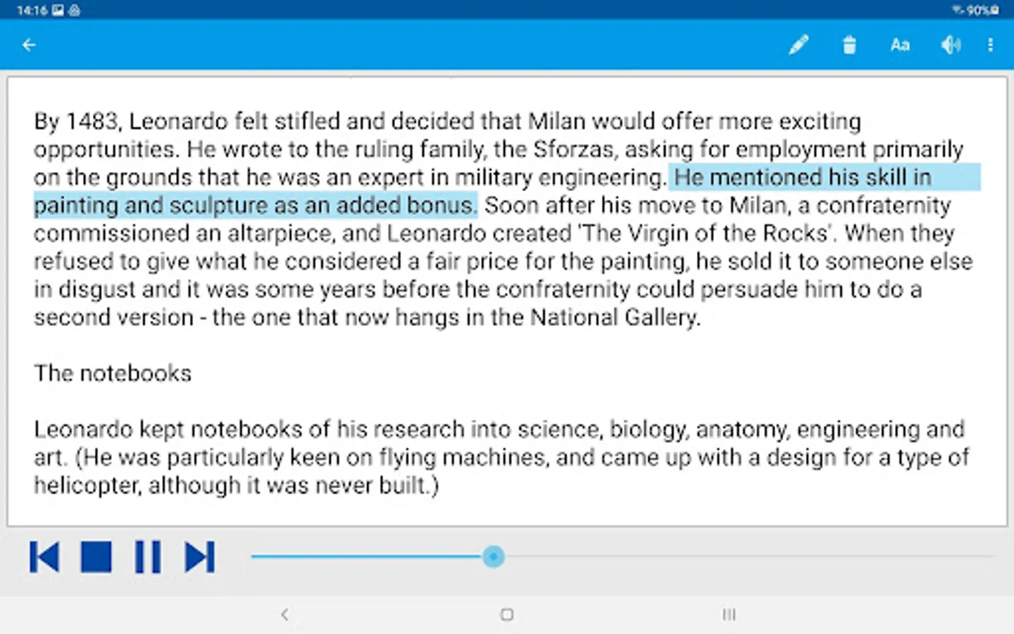 • Text to Speech reader with play, pause, back and forward buttons and a progress bar.