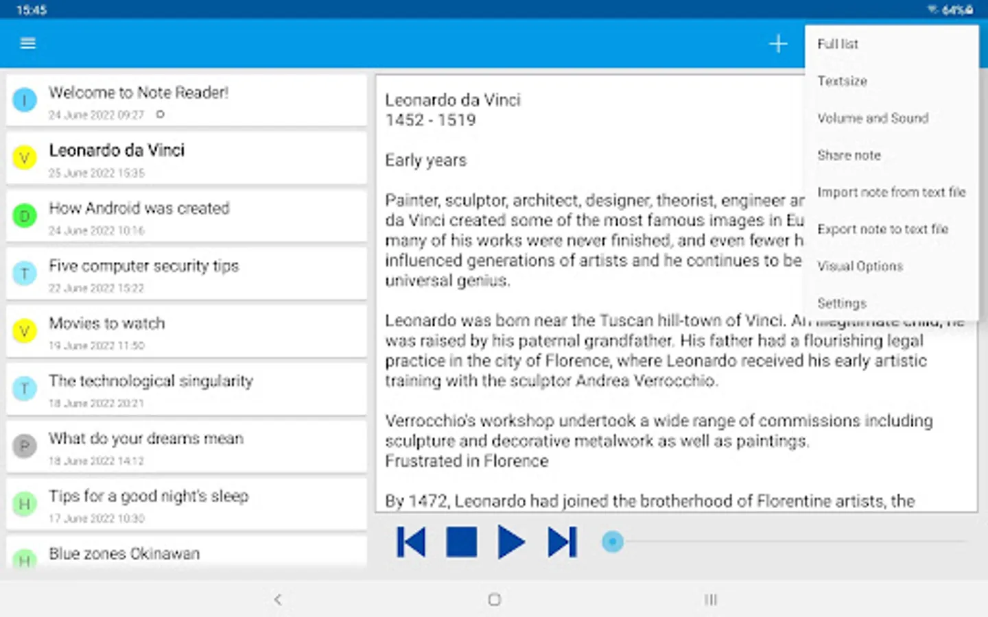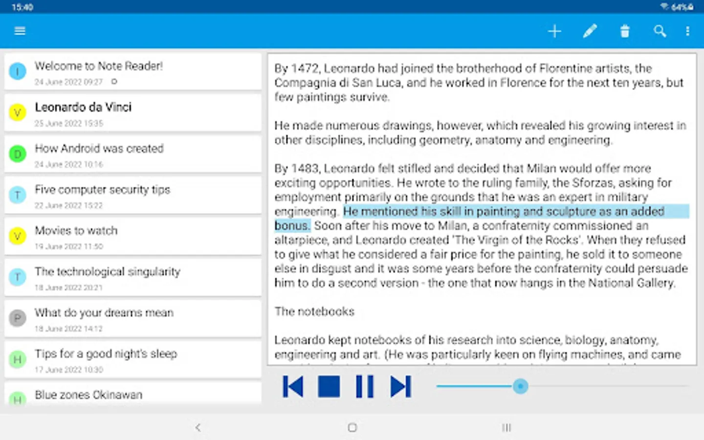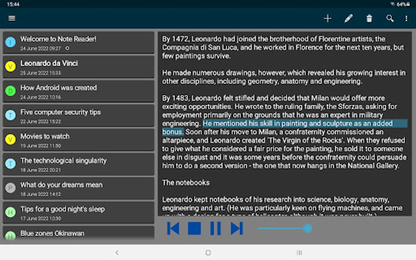 With Note Text Reader you can take notes, scan text and save articles. The app can read aloud your notes with Text to Speech.