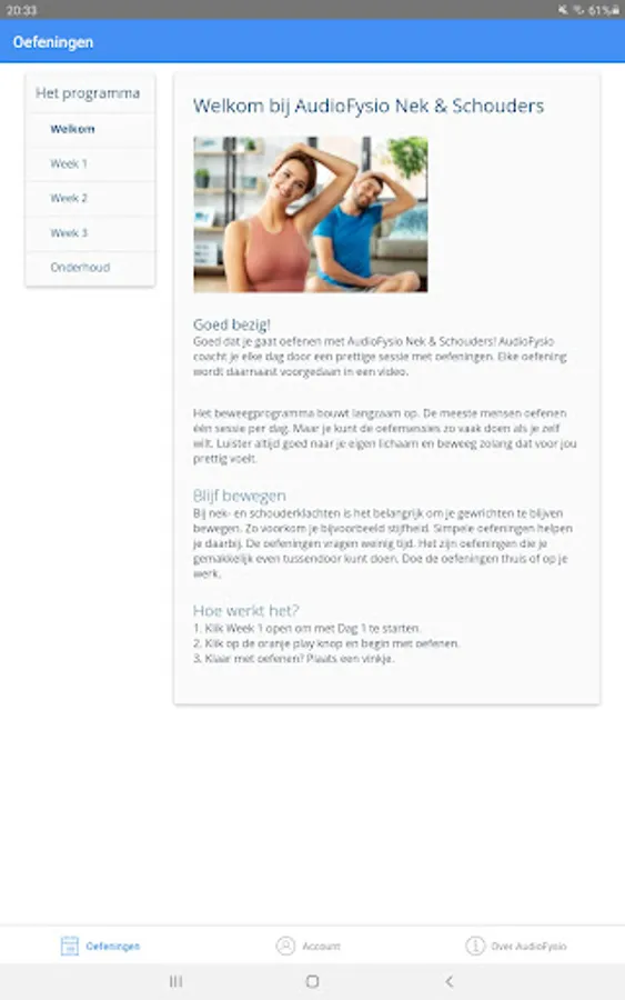 Less pain in your neck and shoulders, less stiffness and more freedom of movement! The Neck & Shoulders app is the Dutch exercise app for the neck and shoulder region.