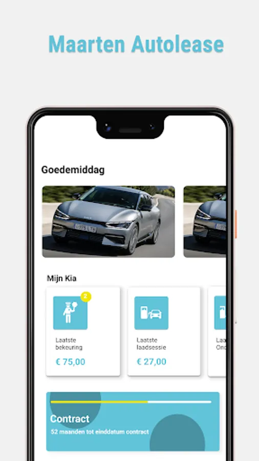 Here you will find all relevant information regarding your lease car. This gives you insight into fuel consumption, fines, insurance data, claims handling and mileage. Contract information can also be found in the driver's booklet. This and much more in the new Maarten Autolease App.