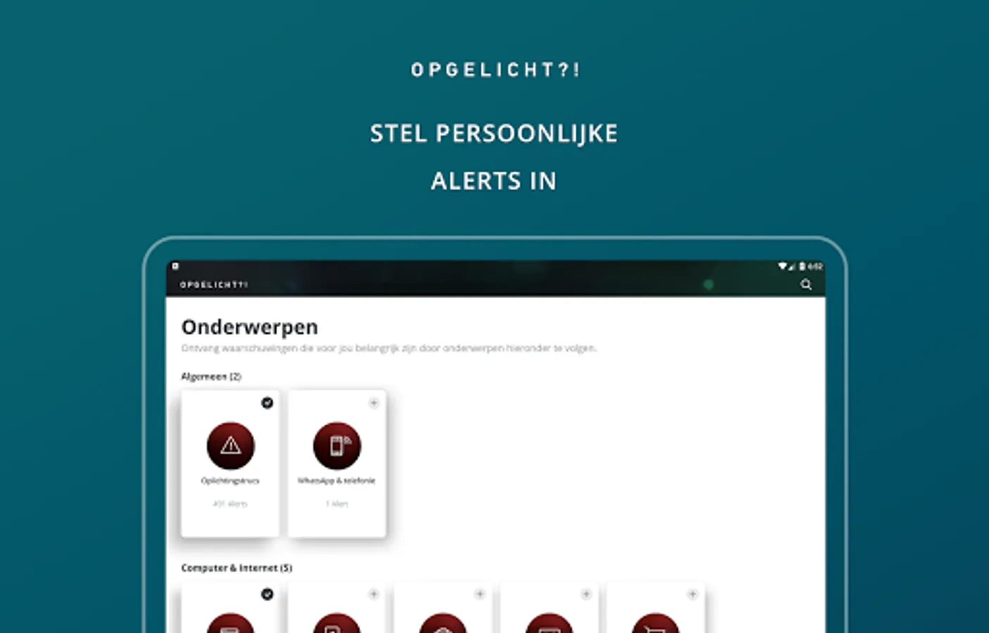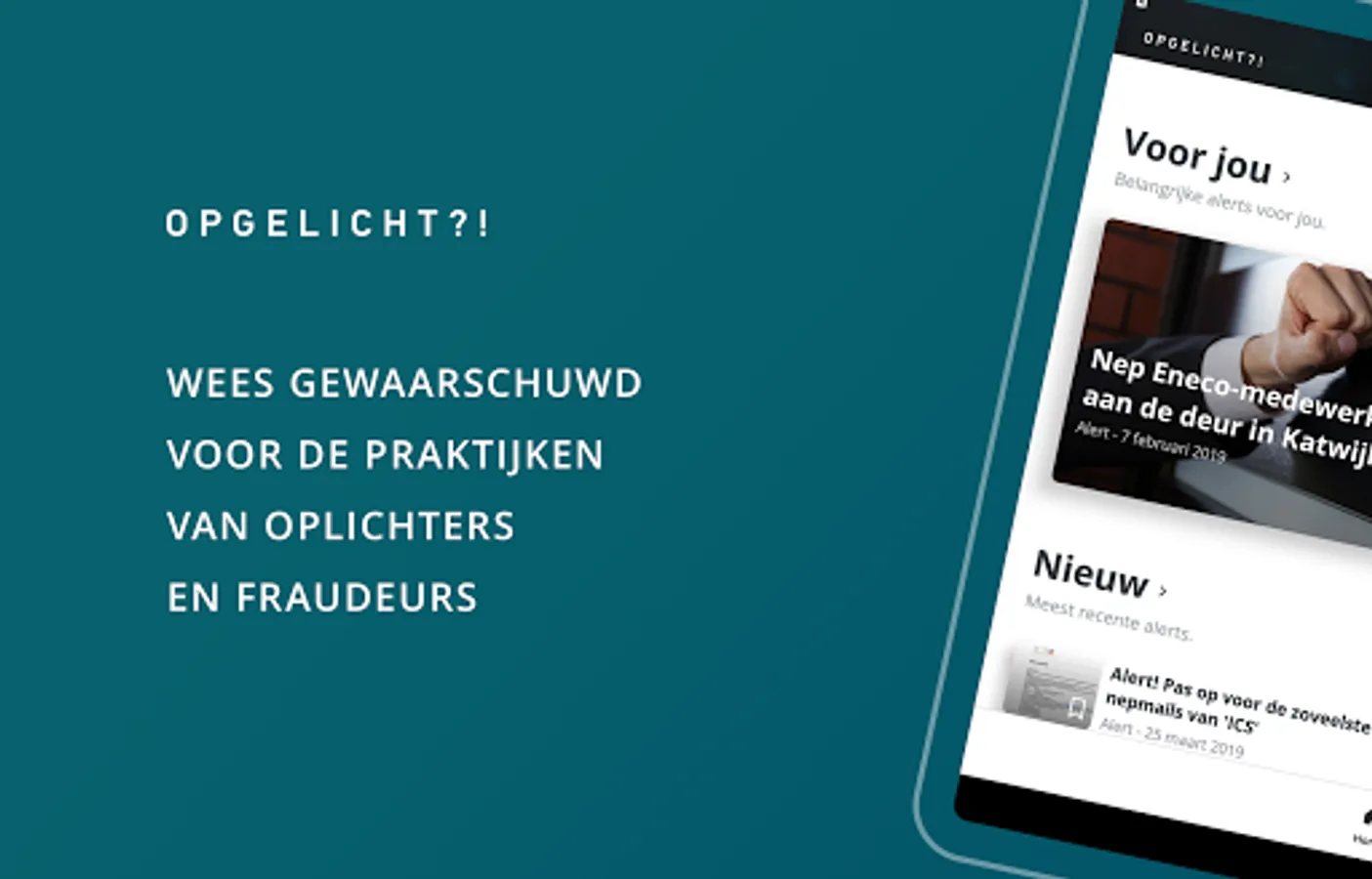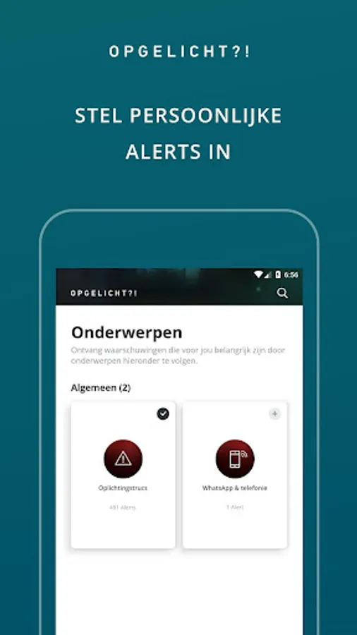 By following topics, you will be notified immediately as soon as we post an interesting alert for you. Also sign up for warnings about your own bank or credit card company. Because of this you will be the first to know and you will not be scammed. The use of the Opicht?! App is completely free.