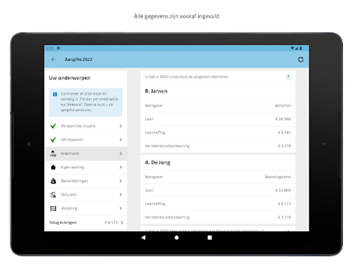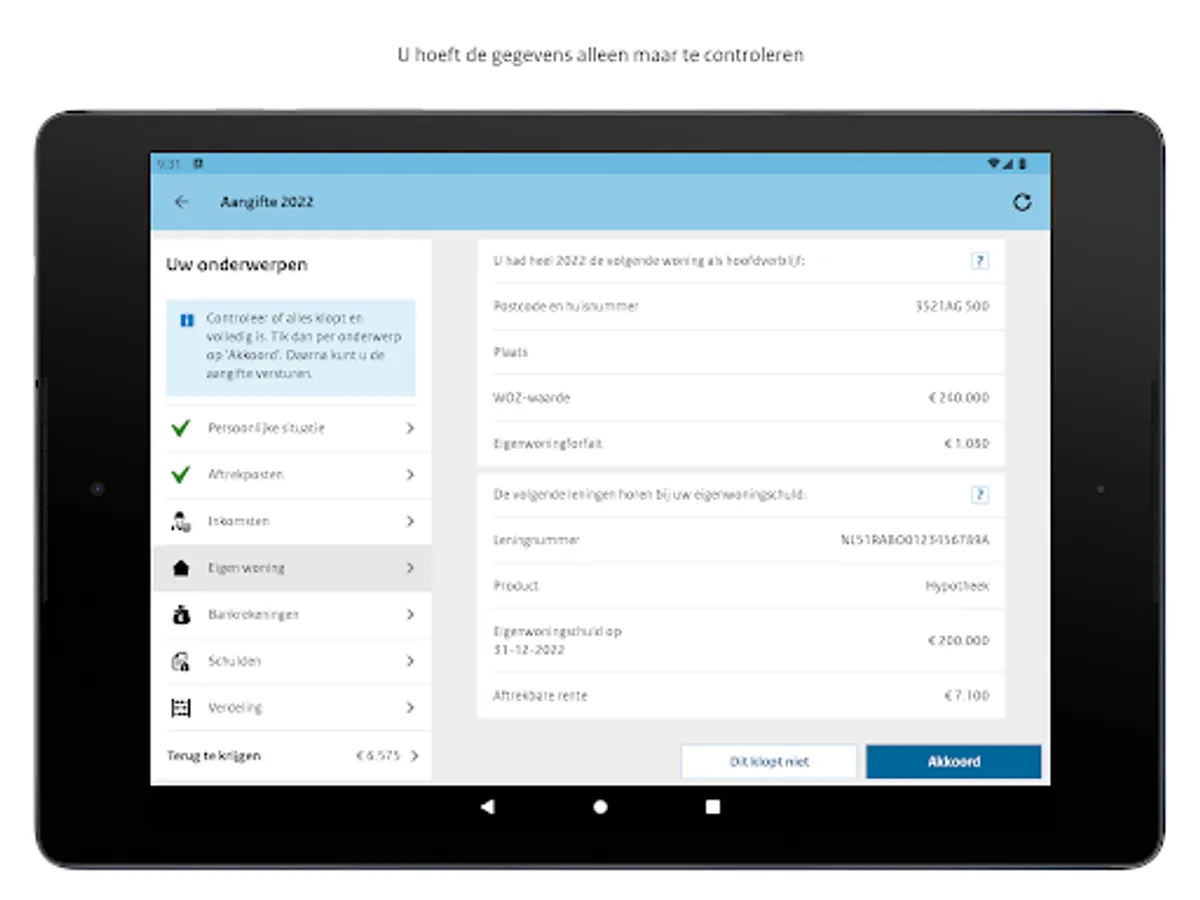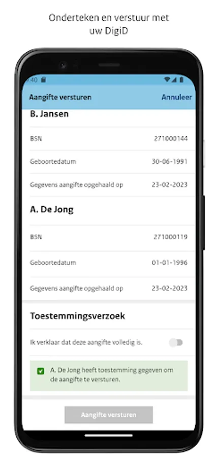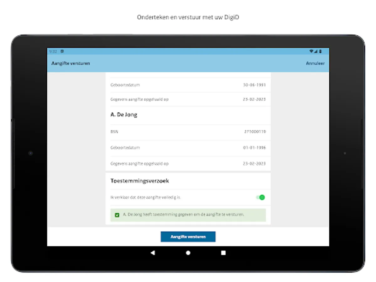 You retrieve your data with your DigiD. Then you check them. Is everything correct? Then you can immediately sign and send your declaration.
