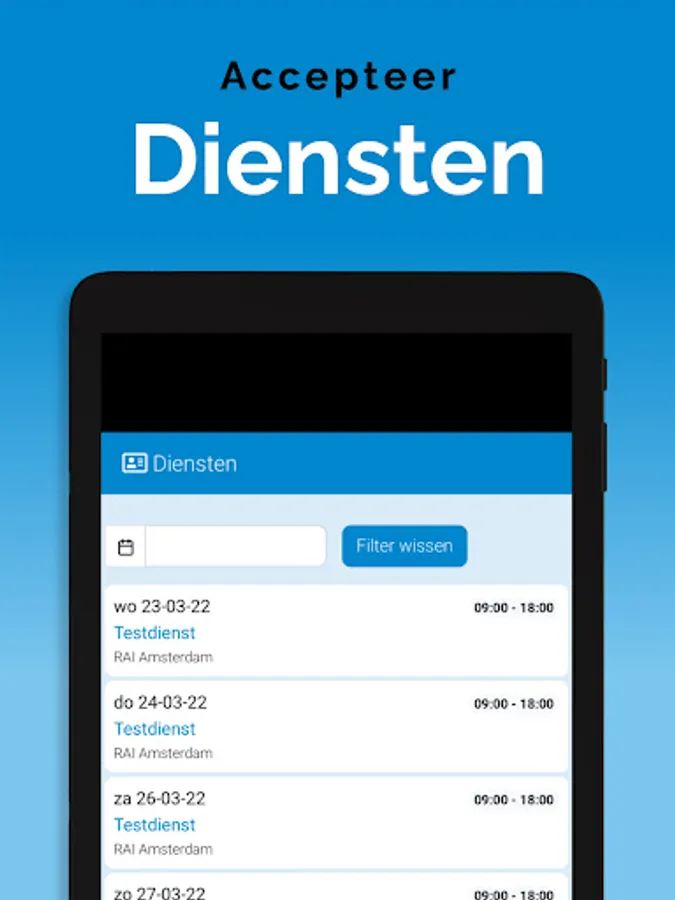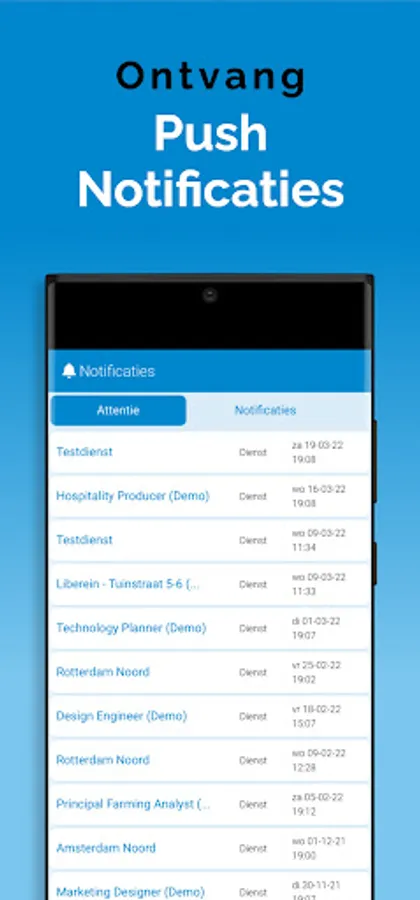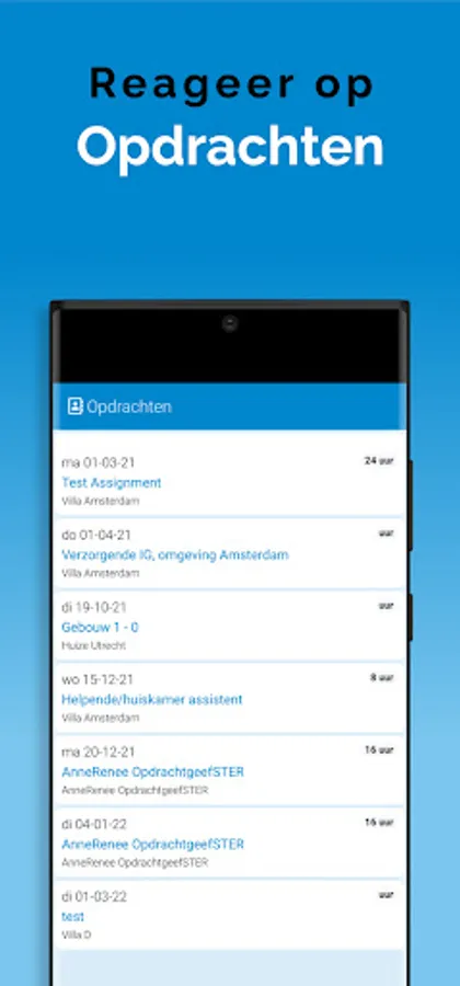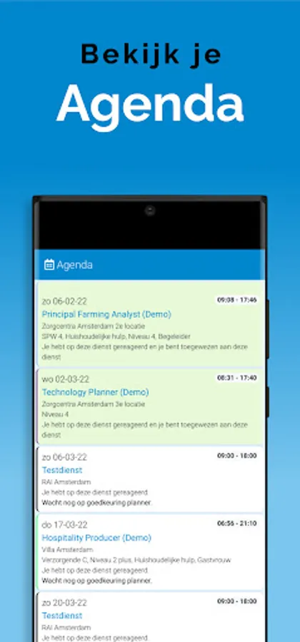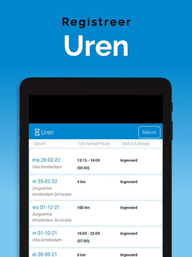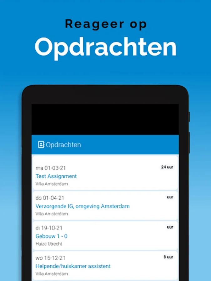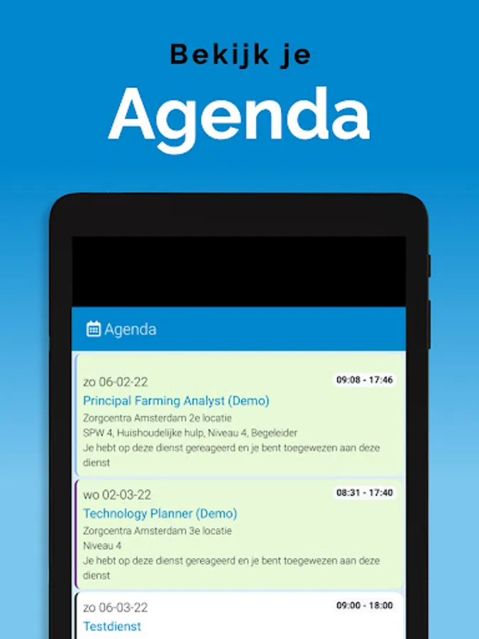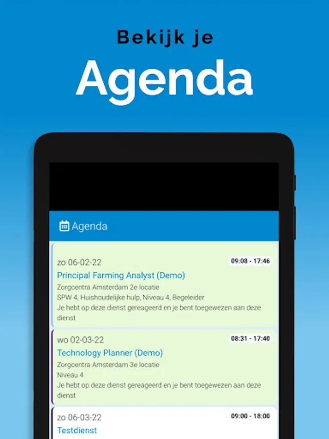As a flexworker of De Nationale Zorg, you can use this App to view and accept services and assignments, register hours worked, prepare and send invoices, time sheets and view the agenda. The App is linked to the system, so that information is always up-to-date, via a clear dashboard. In addition, important notifications, as newly available assignments, arrive on the device via a push notification. That way you don't overlook anything. Changes are also immediately visible, also in the agenda. So you are always in the right place. You can also contact De Nationale Zorg directly via the Chat within this App. Ideal if you still have questions about something.