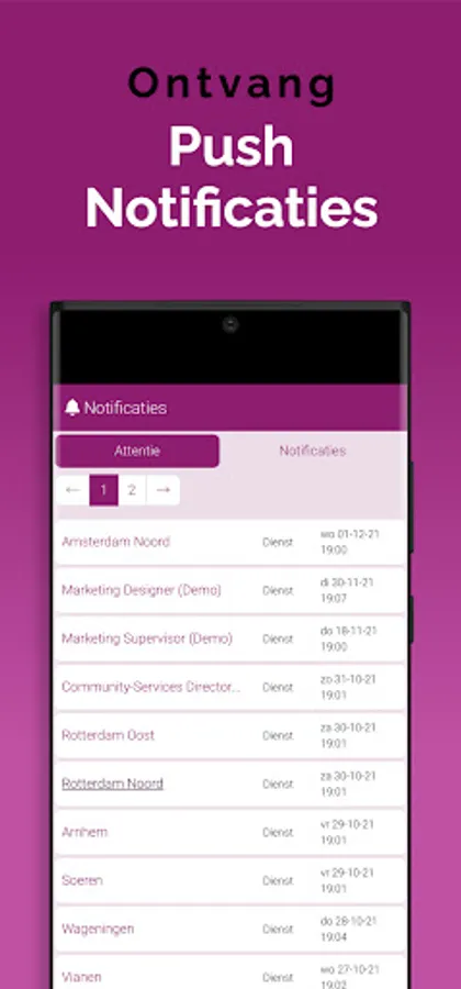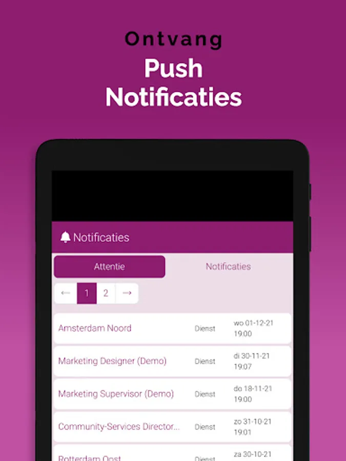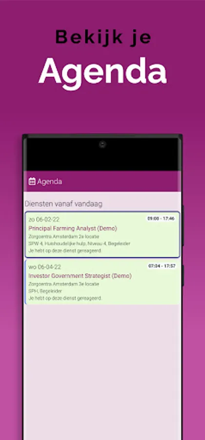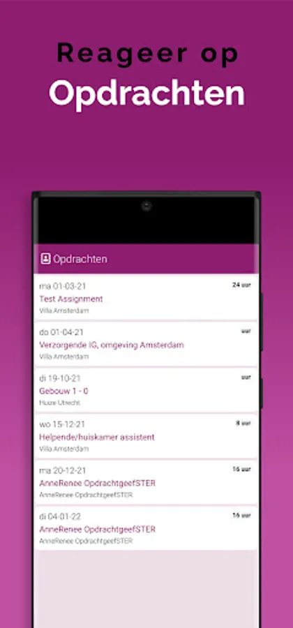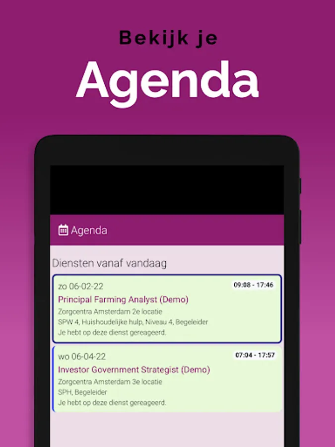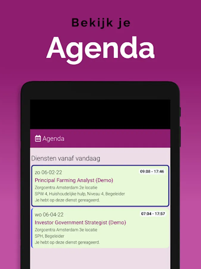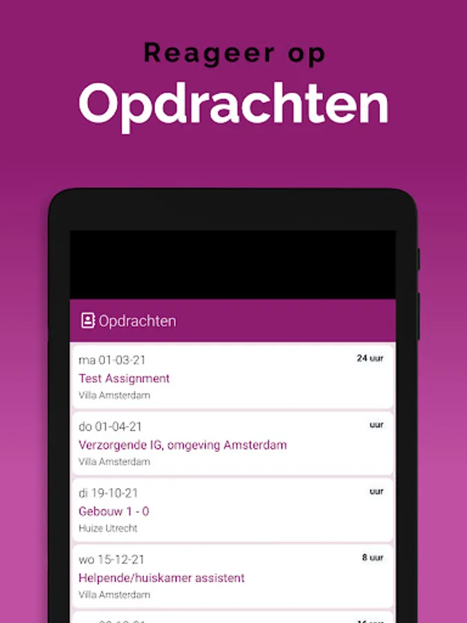 The App is linked to the system, so that information is always up-to-date, via a clear dashboard. In addition, important notifications, as newly available assignments, arrive on the device via a push notification. That way you don't overlook anything. Changes are also immediately visible, also in the agenda. So you are always in the right place.