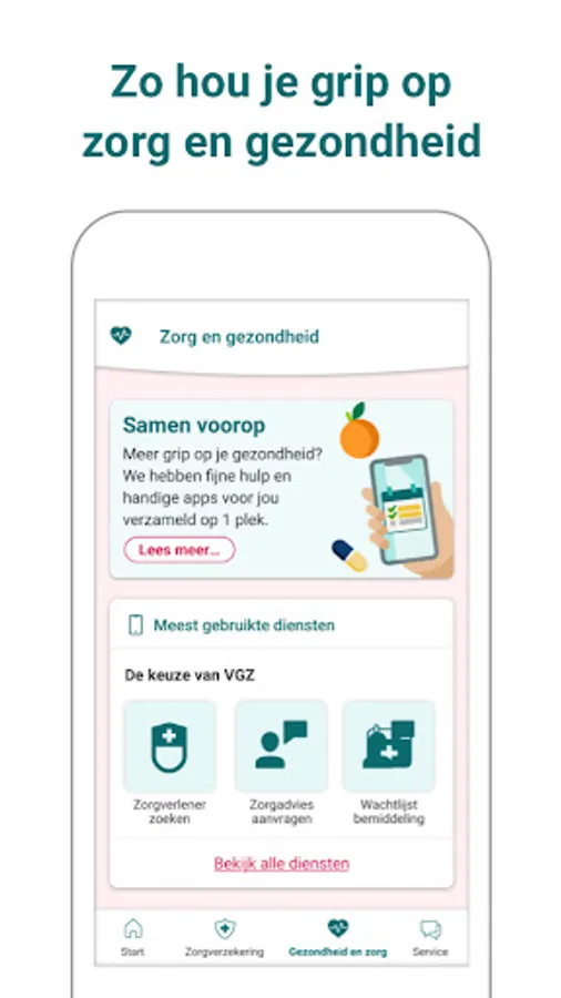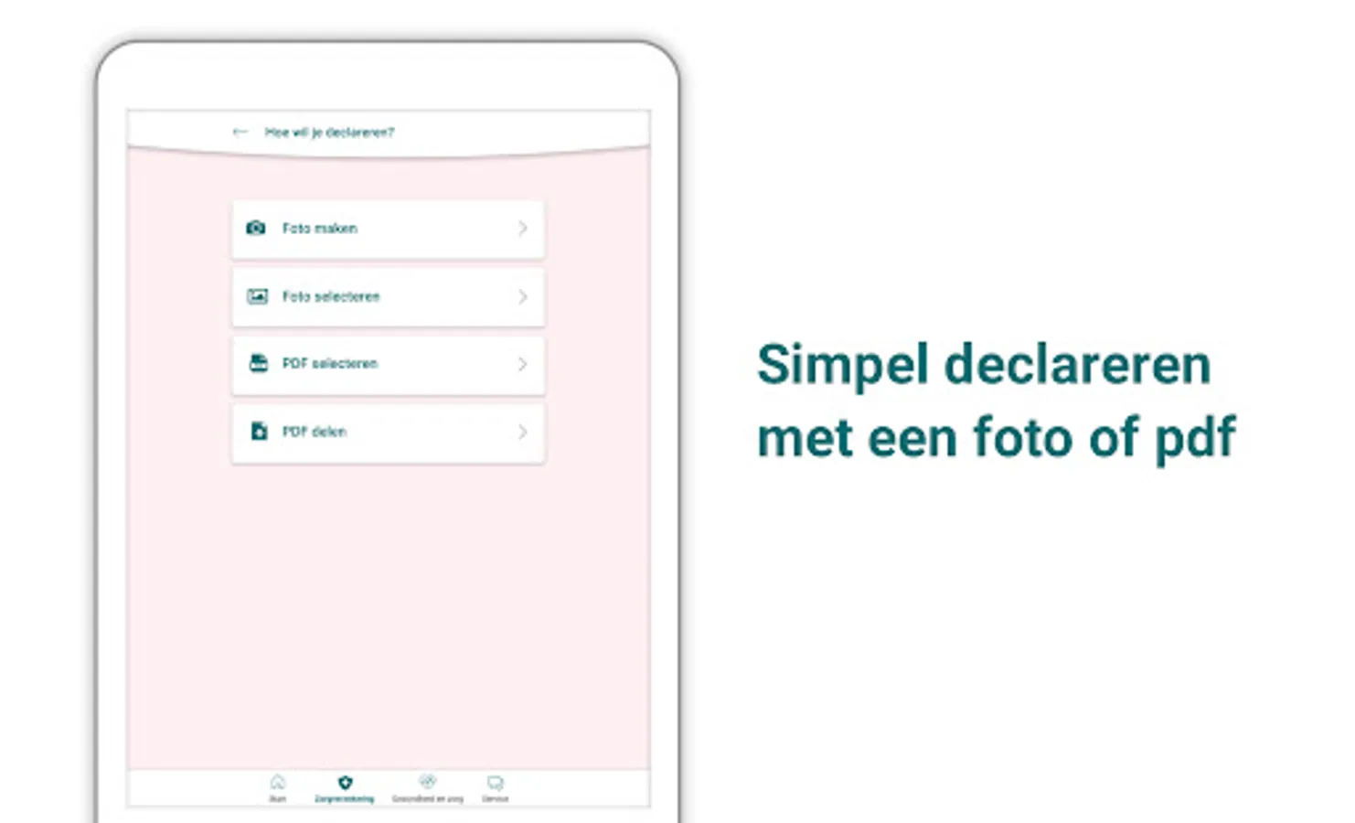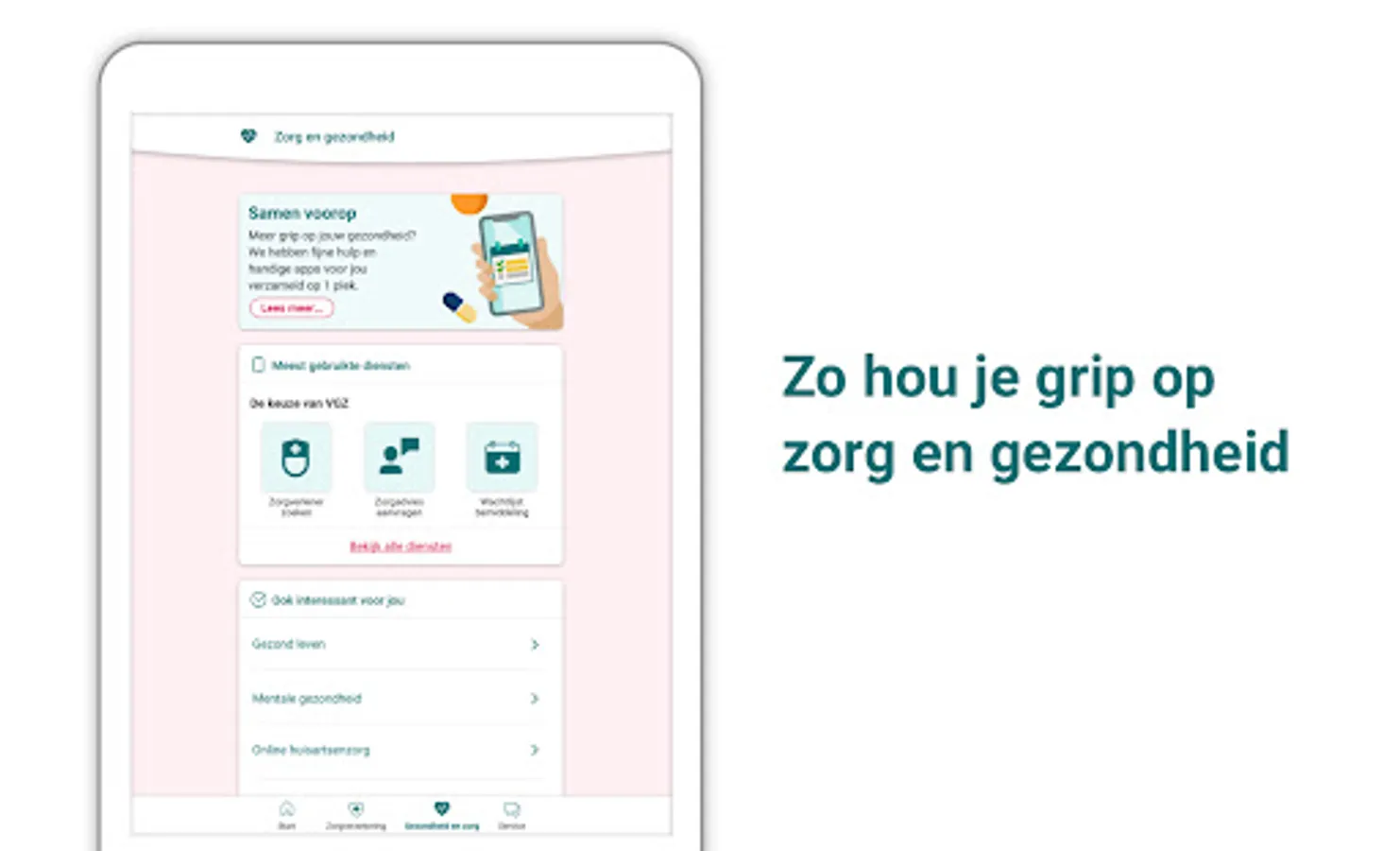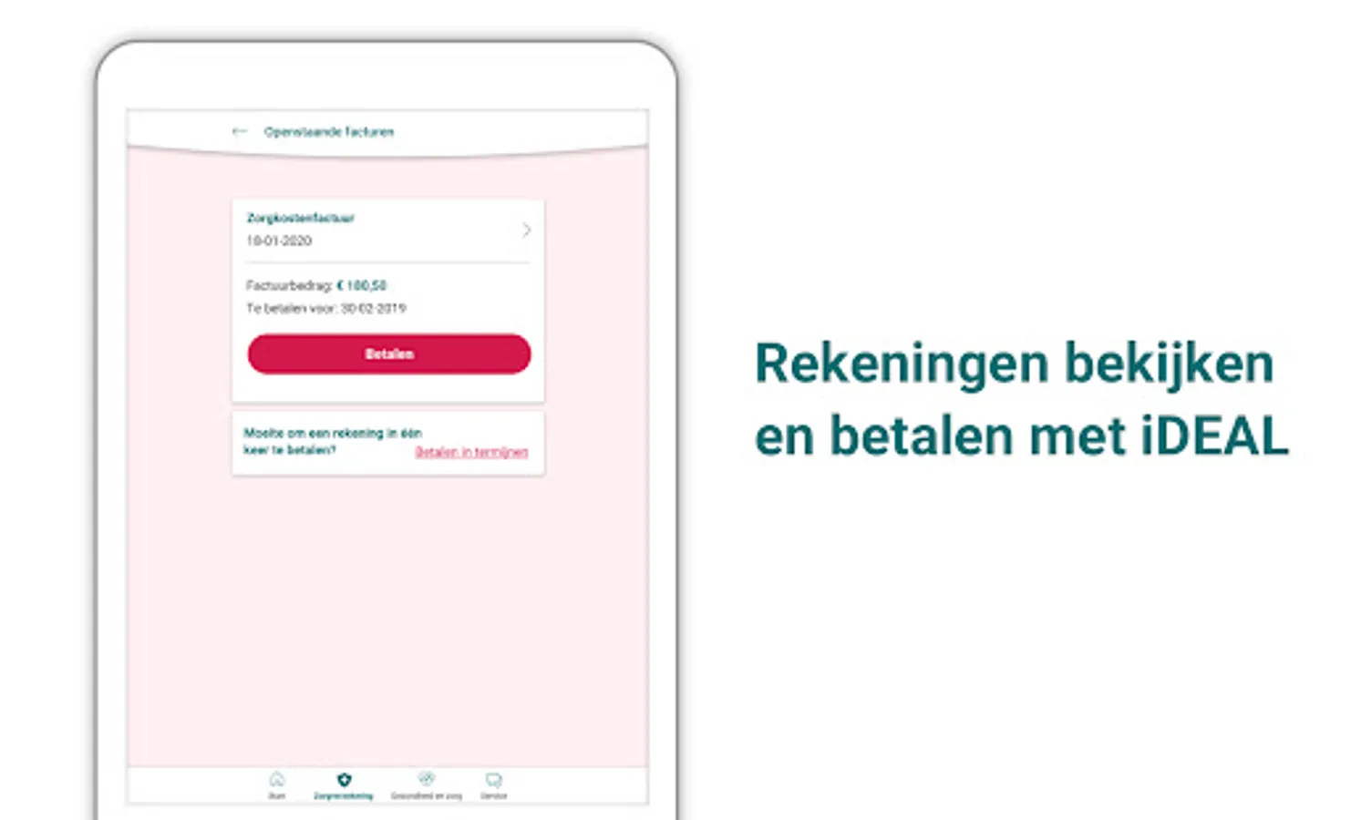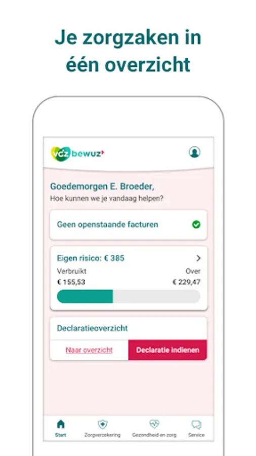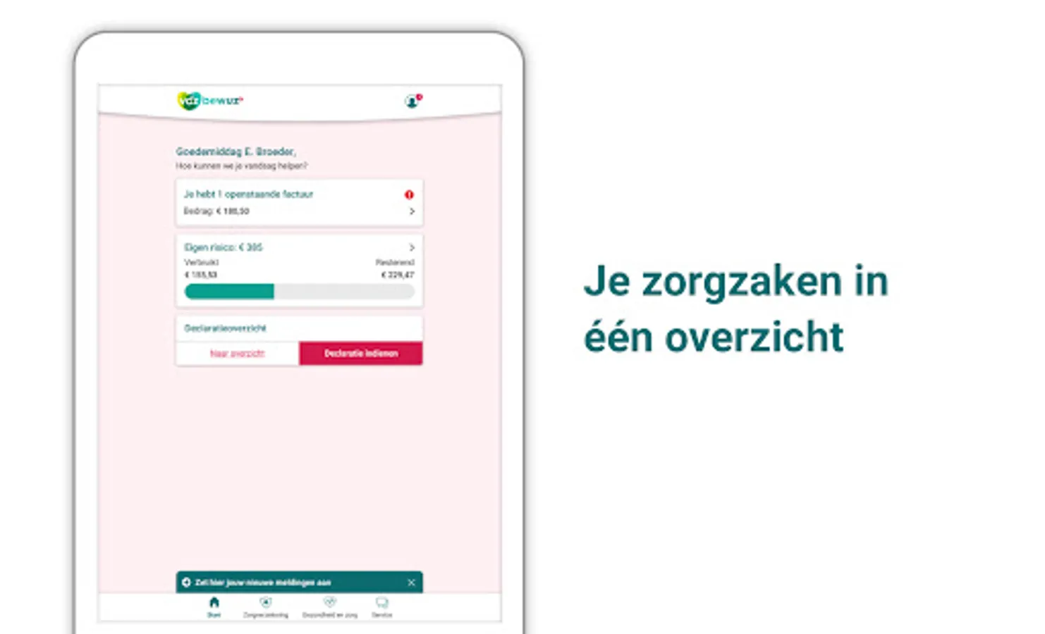 That is why you can declare with the VGZbewuzt app in a few simple steps. The app also shows you what you will be reimbursed this year for, for example, physiotherapy and the dentist. And what the position of your deductible is. Got a health care bill? You pay directly from the app via iDEAL. And a great idea: you now always have your health insurance card and policy at hand.