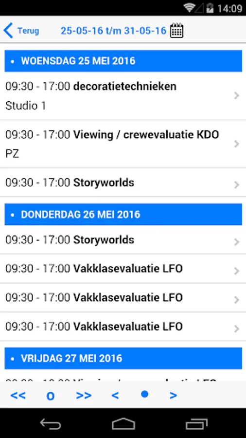 You can navigate to next, current and previous week and day and choose a specific date.