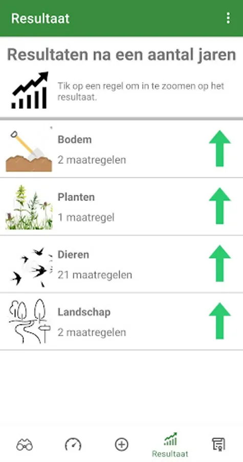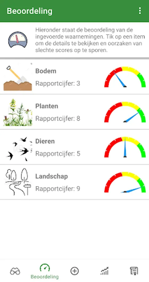 Students enter a grassland plot with shovel and this app and record in the app how the soil, plants, animals and landscape are doing; where all properties of these four categories can be assessed visually, directly in the field. Based on the observations entered, the app determines a score and indicates where problems are. The student is challenged to look for solutions. The student can enter measures in the app, which are intended to improve problem situations. Ultimately, the student is shown the result of the measures and a personal score (acquired knowledge points) that indicates whether the measures chosen were useful.