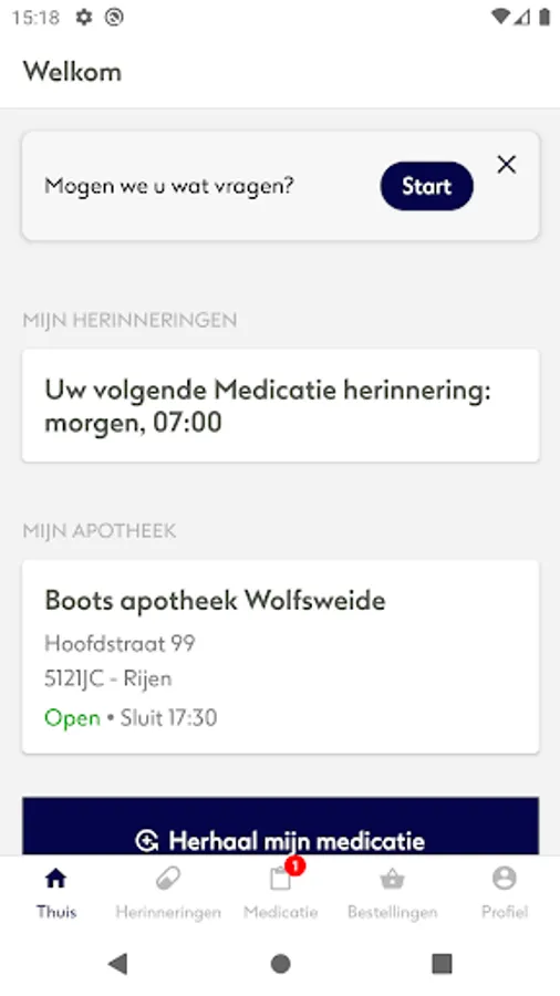 The Boots pharmacy app offers you the convenience to view information about the medication delivered to you, when it suits you. You can set reminders via the medicine alarm to never forget an intake. You can also easily place a repeat order at your pharmacy at any time.