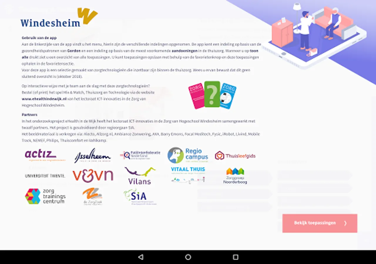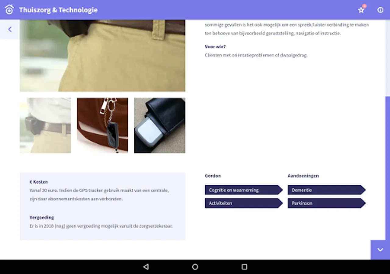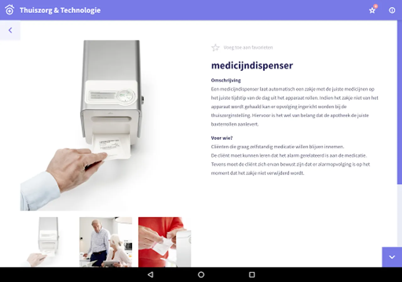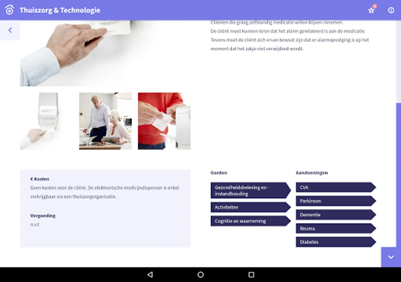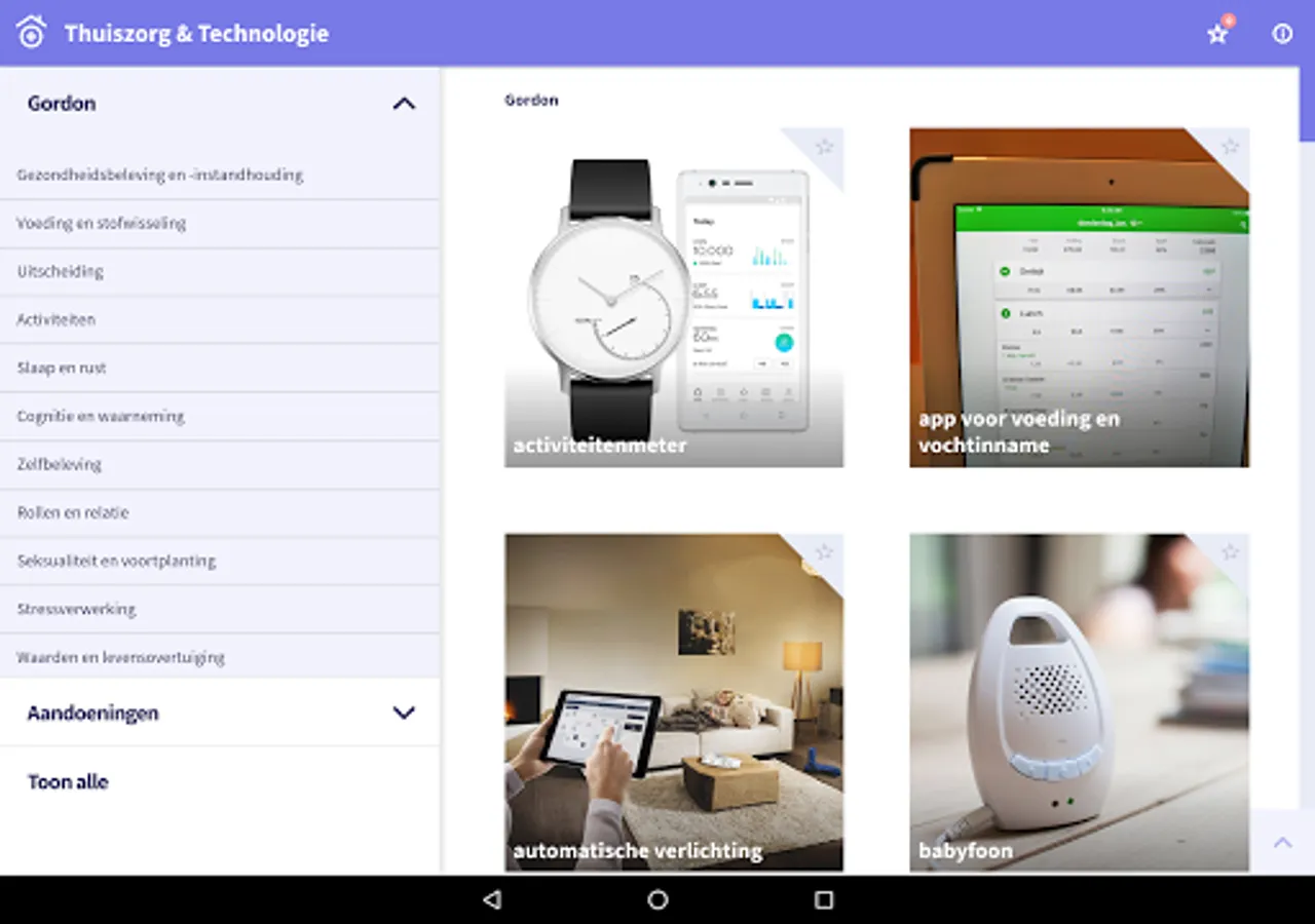 Thuiszorg & Technologie is an app to discover different care technologies that can be used in home care. The app has various layouts that are appropriate to the work process of the district nurse, but can also be used by other healthcare professionals. There is a classification based on the health patterns of Gordon and a classification based on the most common disorders in home care.