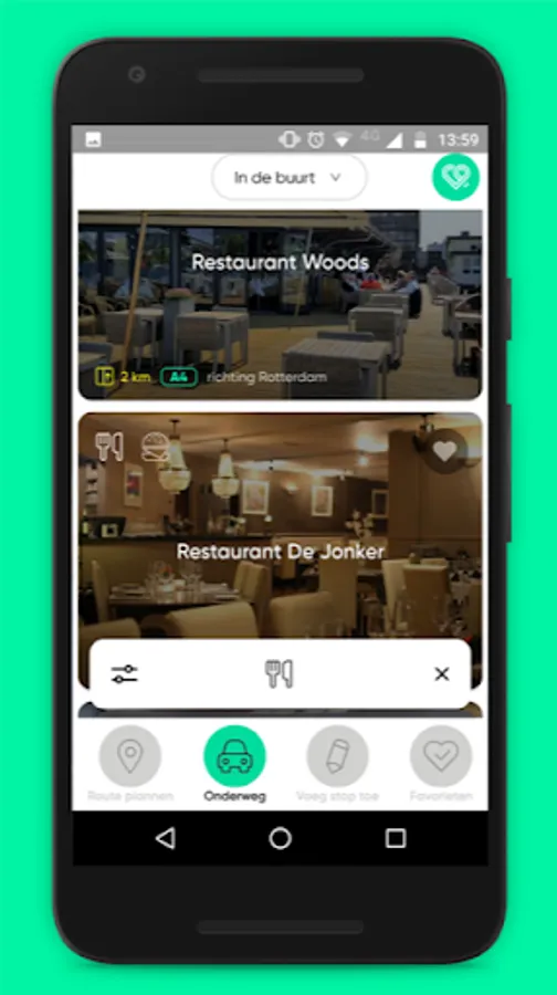 Do you often dread the long car-ride? Let that reluctance be in the past by only stopping at places you enjoy. Exchange the lonely parking lots for a picnicking spot or a place to go for a swim. Don’t want to bring your own pre-packed lunch? Visit an actual restaurant to your taste! Want to stretch your legs? In the app you can find countless parks, museums, villages and theme parks by searching within the categories: relaxation, entertainment and culture. Use the filter to find out which of the, thoughtfully picked out, stops suit your needs. You can filter by type of stop or available facilities. Before even taking the exit, you will know what to expect.