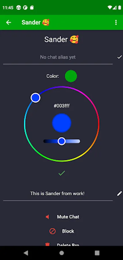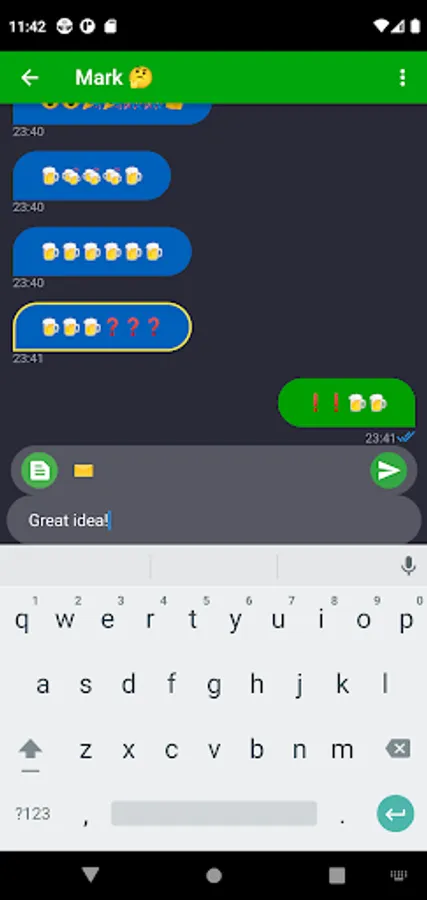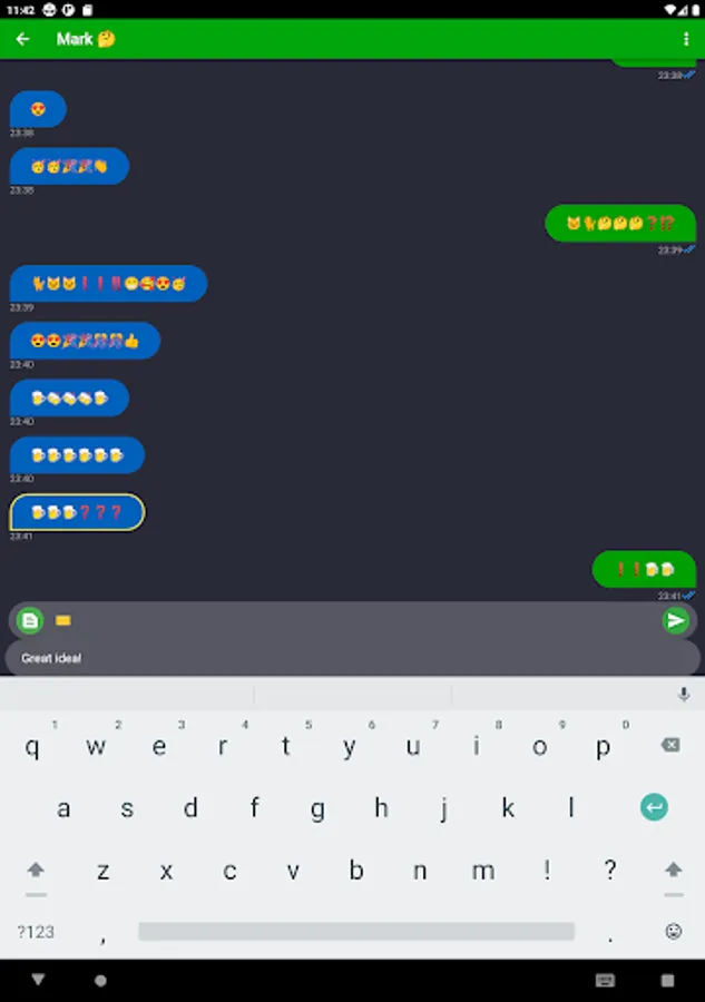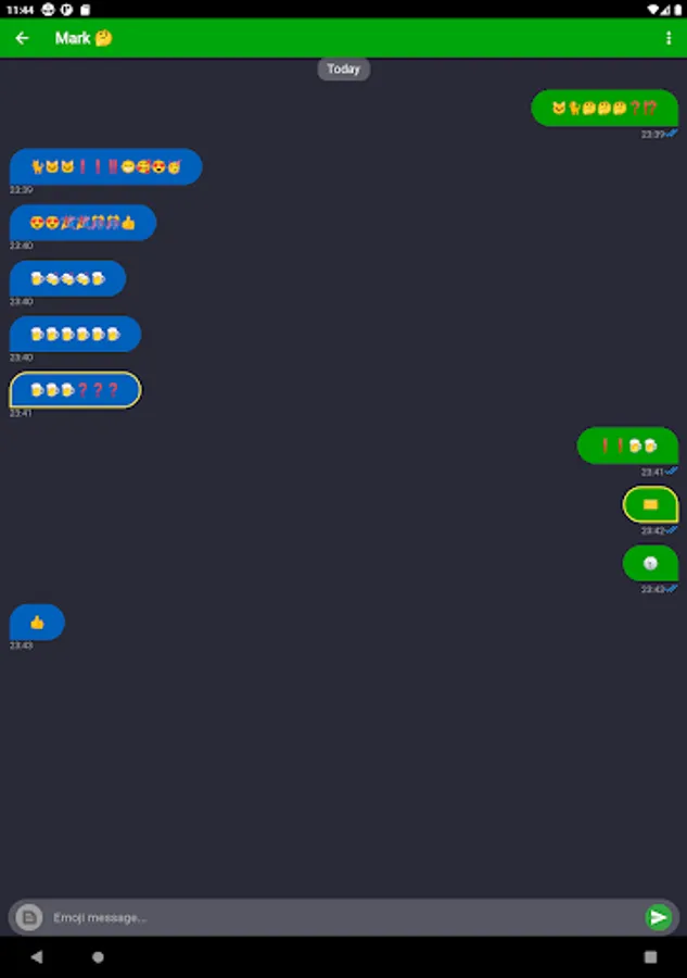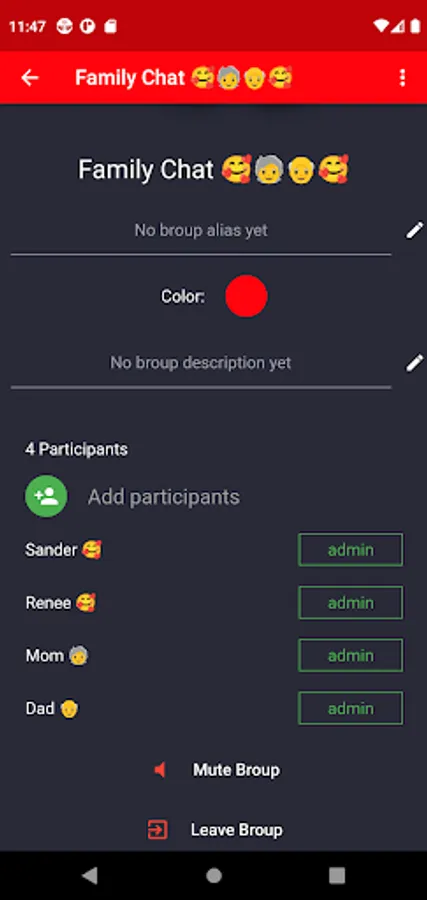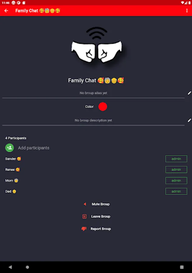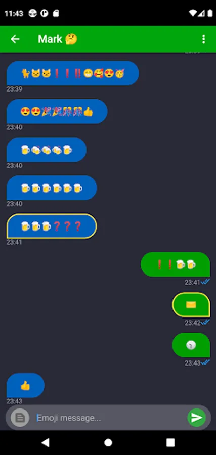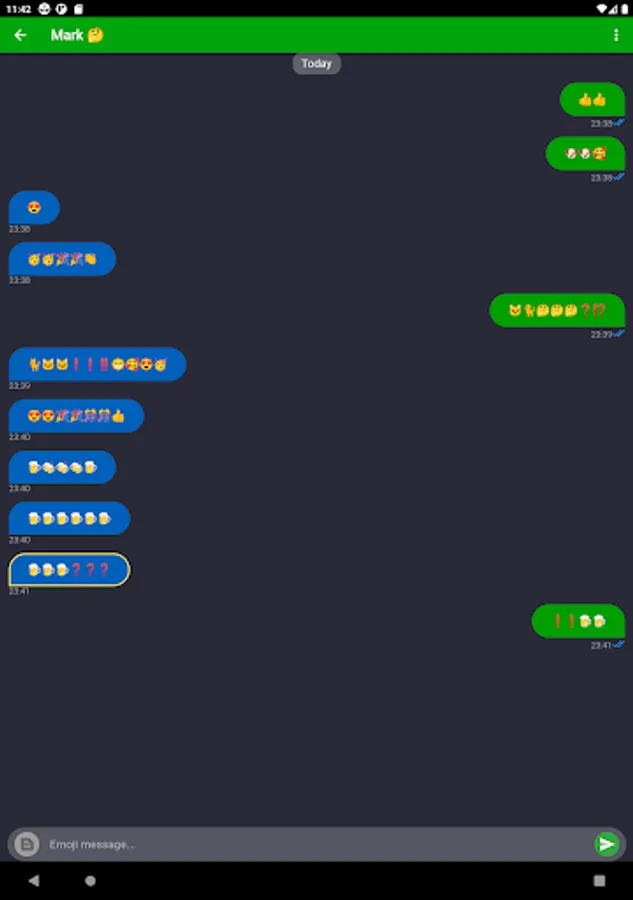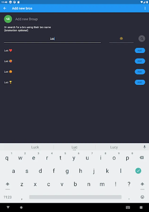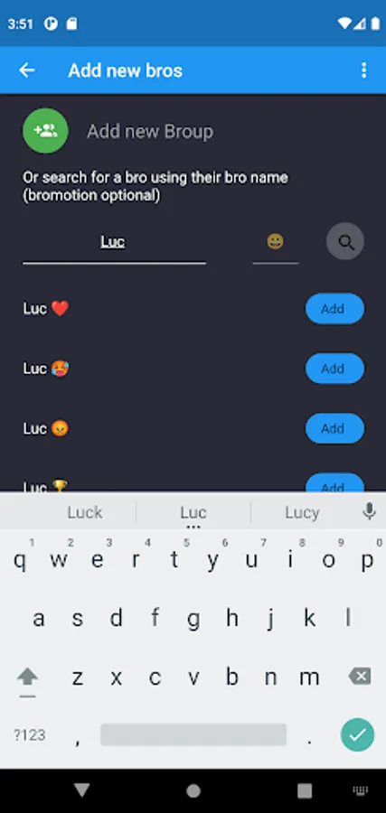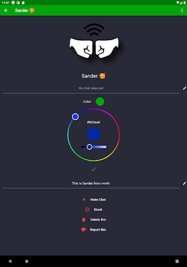 After you added your bro you can customize the chat with a color or a special description. Within this chat you and your bro are free to share your deepest emotions by sending emotional messages. If it gets to difficult to converse using only emojis you can possibly append your emotion with some plain text.