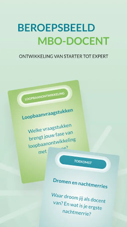 This app is based on the dialogue cards developed by the BVMBO in response to the professional image for the MBO teacher. These dialogue cards can also be ordered as a set of cards via www.bvmbo.nl/beroepsbeeld.