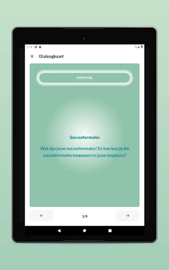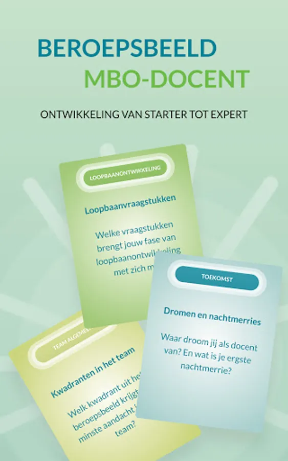 This dialogue app aims to support teachers and teacher teams in conversations about career development. The app contains 48 questions that can be the starting point for individual reflection on personal career development and ambition, for a development interview with a manager, or for a dialogue within the team about the use of each other's qualities.
