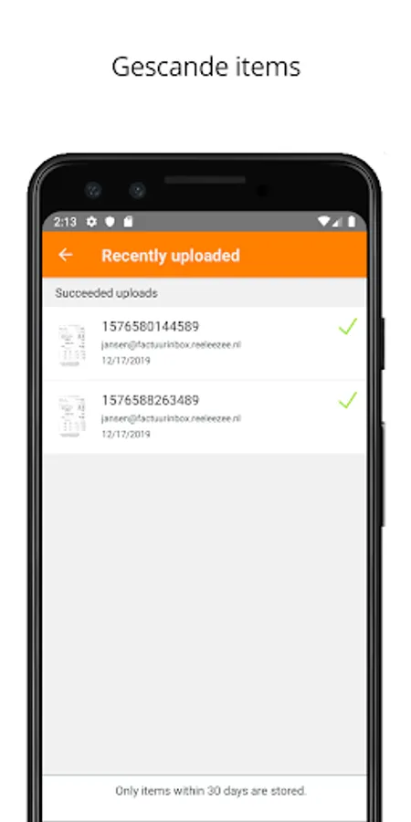 With the Scan2Reeleezee app you take a picture of your purchase orders and purchase invoices. The app converts the photo into a PDF and places it via a secure connection in the inbox of your Reeleezee administration. There the scanned receipts and invoices with a booking proposal are ready to be processed by you or your adviser - whoever does that depends on your subscription. To use this app you only need an email address from your administration inbox. You or your advisor create this per administration. You can set multiple inbox addresses in the Scan2Reeleezee app and change when scanning your vouchers.