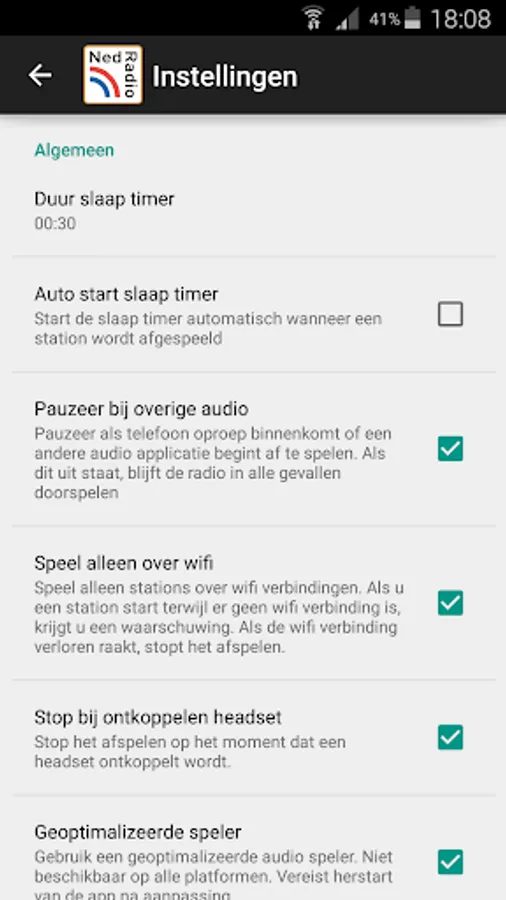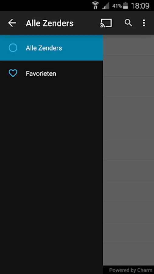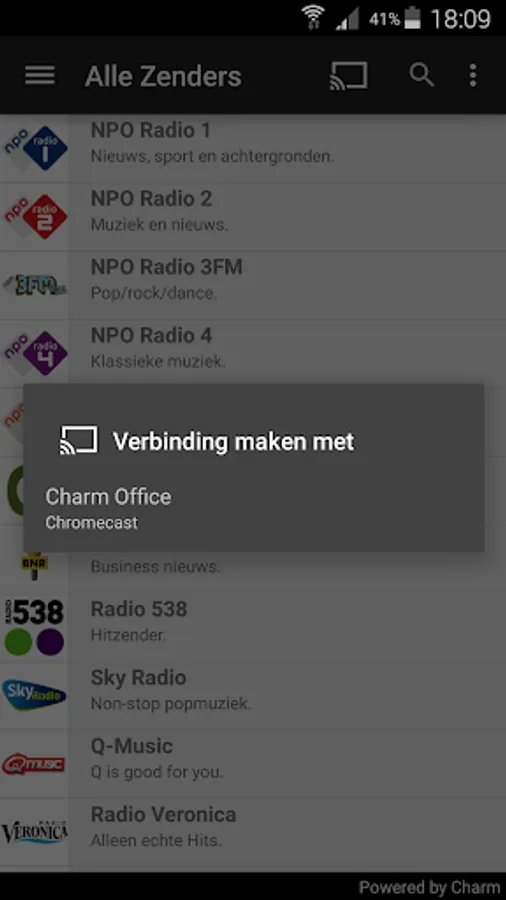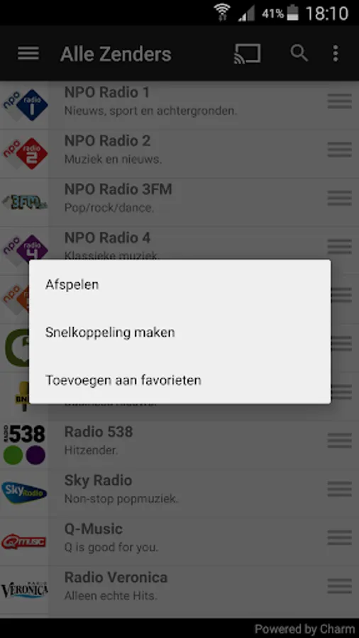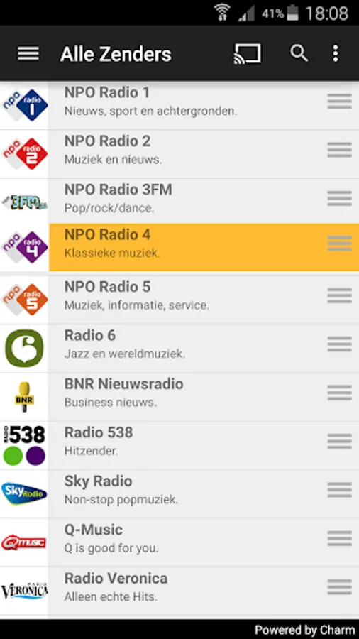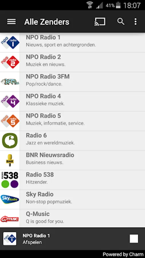 Current stationlist contains among others 538 Top 40 Radio, NPO Radio 1, 2, 4, 5, 6, Radio 3FM, BNR Nieuwsradio, Radio 538, Sky Radio, Q-Music, Radio Veronica, 100%NL, Radio 10 Gold, Arrow Classic Rock, Classic FM, Slam! FM, FunX, RadioNL, Slam!FM Hardstyle, JuizeFM, Decibel, DeepFM, FreshFM, FeelGood, Traffic Radio, PuurNL, Veronica Top 1000, RTL Top 4000, Radio 8FM, Top 2000, Radio West, Soul Radio, Radio Oost, Radio M Utrecht, Radio Tijdloos, Radio Continu, JimmyFM, Omroep Brabant, Radio Bollenstreek, Q-Music Non-Stop, Q-Music Foute Uur Non-Stop, HOi FM, Radio Gelderland, Radio Noord, Groot Nieuws radio, VRT Radio 2 Antwerpen, Radio Flevoland, Radio Hoeksche Waard, Hardcore Radio, FunX Latin, FunX Reggae, Omrop Fryslân, Efteling Radio, Radio 53L8!, Piratenhits, Veluwe FM, Dance Department, 538NL, RTL Lounge, 538 Hitzone, 538 Festival Radio, 538 Party, JFK Ibiza, 538 Ibiza, Geweld Uut Twente, Sublime FM, Crossroads Country Radio, Wos, ALLsports Radio, Sterren.nl, Gooisch Music, Omroep Groesbeek, FunX Arab, FunX Hip Hop, FunX Dance, FunX Slow Jamz, AVROTROS Baroque, AVROTROS Old School, AVROTROS Easy Listening, AVROTROS Film, AVROTROS Puur, AVROTROS Fifties, AVROTROS Sixties, AVROTROS Toppers, Studio ANT, Candelight Radio, Belgian Oldies Radio, Reformatorische Omroep 1, Sky Radio Christmas, Klokradio, SRC FM, FreshFM streams, 18Hits, Slot Radio, RTV Lansingerland, NPO Radio 4 Jong Klassiek, NPO Radio 4 De Klassieken 24/7, NPO Radio 4 Eigentijds, NPO Radio 5 Orgelradio, NPO Radio 5 Radio Religiosa, Hits één, Radio 10 streams, Sky Radio streams, Veronica streams, Radio 192, Arrow Caz!, Radio Bluemoon, 100% Feest, 100% Liefde, Radio Extragold, Alaska Radio, Gold Star Radio, PeeLLand FM, Big City Radio, Pinguin Radio, Sky Radio 00s, Gigant FM, RTV Drenthe, A28FM, Urk FM, Urk FM Geestelijk, Music Radio All4You, Smooth Jazz Jams, BDJ Radio, Concertradio Gregoriaans, New Business Radio, Radio Parkstad, Reformatorische Omroep 2, Havenstad.FM, Focus 103, HumorZender, 538 Verruckte Stunden, Radio Mi Amigo, Studio Brussel, Radio Zeeland, Radio Caroline 259 Gold, Radio Caroline 319 Gold, Radio Monique 963 Gold, Radio Atlantis, Scheveningen Radio, Radio 10 Zomer Hits, Radio 10 Guilty Pleasures, Radio 10 Let's Dance, Radio L1, Sky Radio 80s, Sky Running Hits, Sky Summer Hits, Veronica Drive-in Show, Trance FM DJ/Classics/Progressive/Hardstyle.