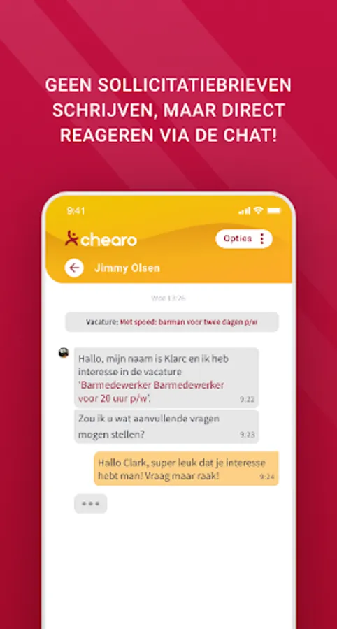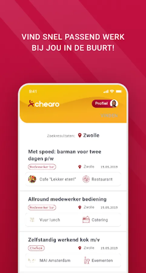 With the CHEARO app, we bring employers and employees (Hearos) in the catering industry together. Without the intervention of a payroller or broadcaster! So direct contact and mutual agreements. Hearos (employees) quickly find a suitable position and employers quickly and easily distribute their vacancies to a large group! Employers You can quickly and easily create vacancies based on your company profile. If Hearos respond, you can view their profile and do business directly via chat.