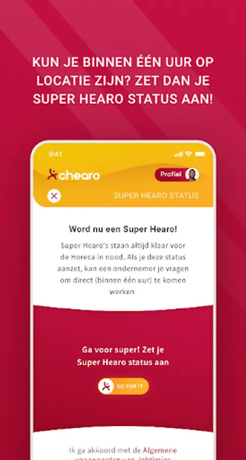 If you register as an employee you become a Hearo; a hero for the hospitality industry. With your profile you respond to vacancies that come into your personal overview based on your preferences. With one click you open a chat conversation to do business right away!