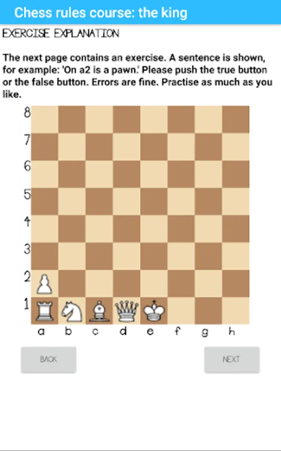 The course aims to be a user-friendly, safe, commercial-free and motivating way to learn chess, step by step. Every course part exists of an explanation, followed by exercises. There is no exam, or track of score; it's perfectly ok to make as many errors as needed. Because of random selection of exercises, repetition may occur. Please be patient. Repitition is the mother of skill.
