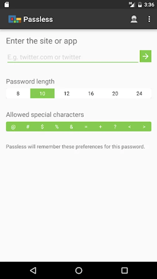 Passless solves the problem of generating and remembering strong passwords for you. Just enter the name or address of a website. Passless' smart algorithm makes sure that it doesn't matter whether you, for instance, enter Twitter or http://login.twitter.com. For your convenience you can just copy/paste the web address into Passless.