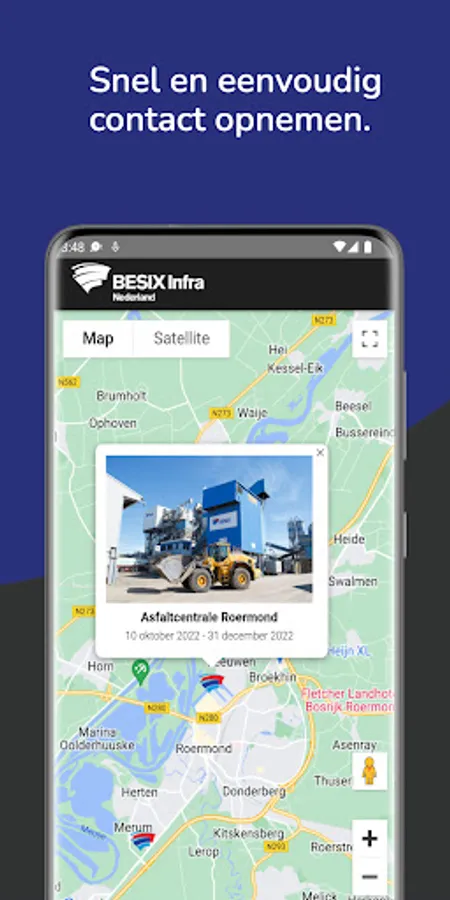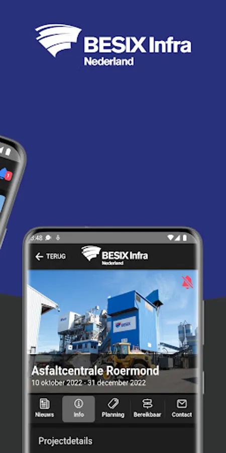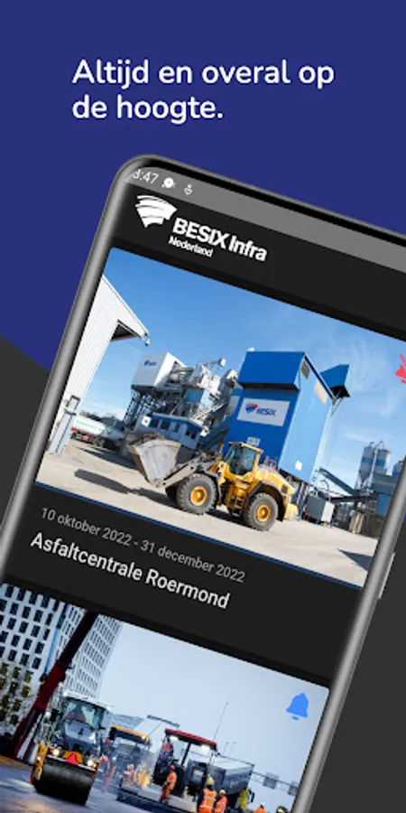 With the BESIX environment app you are always aware of the current BESIX projects in your environment. Through this app you will receive information about our road works, closures and schedules. You also have the option to contact us or to stay informed of the latest news through push notifications.