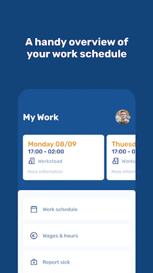 Everything you need to know for work in one place! The app gives you easy access to your work schedule and hours worked. Furthermore, you’ll get a notification when your pay slip in your own language is available. In addition, you can make requests for holidays, work clothing and declarations.
