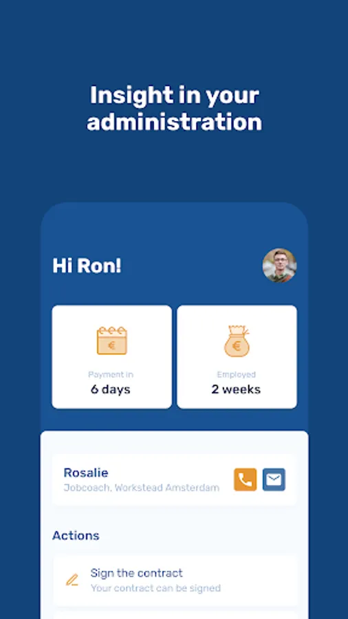Is there anything you need to sign? Or do you need to take action? The app tells you exactly what to do! Via your Dashboard you can also contact your jobcoach and you can see an overview of your salary and employment.
