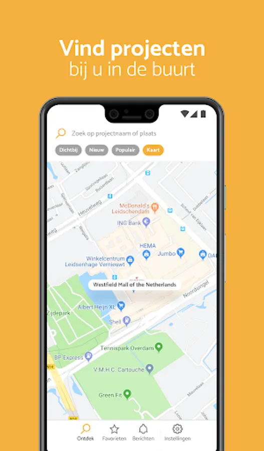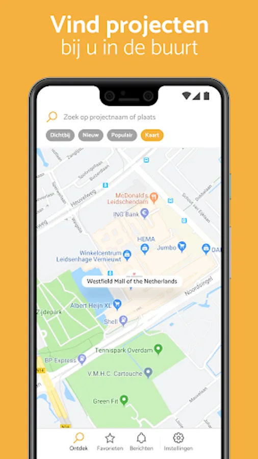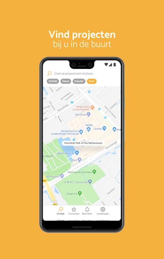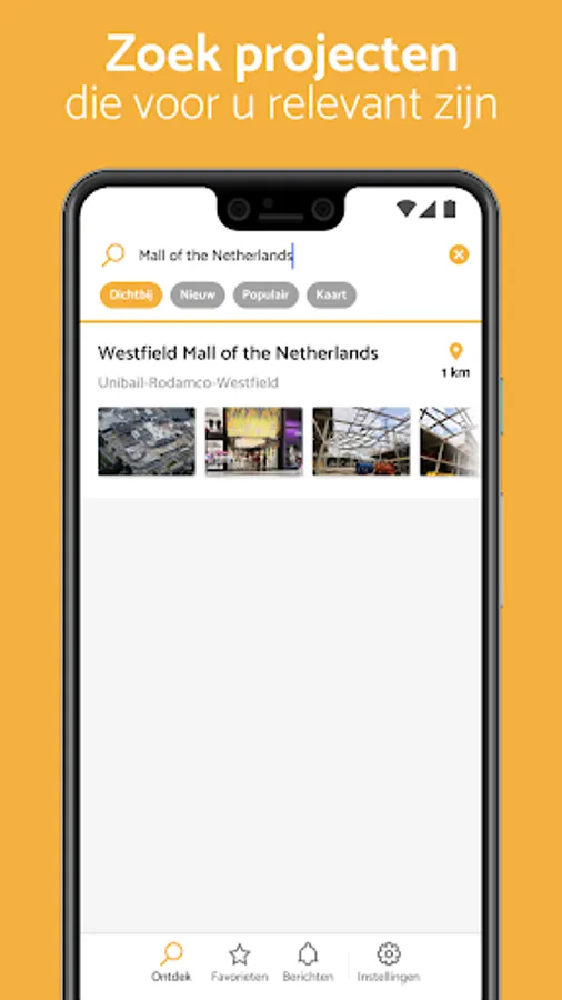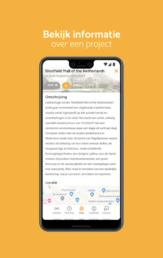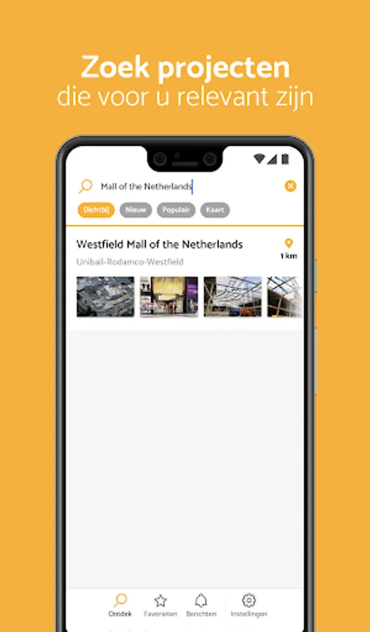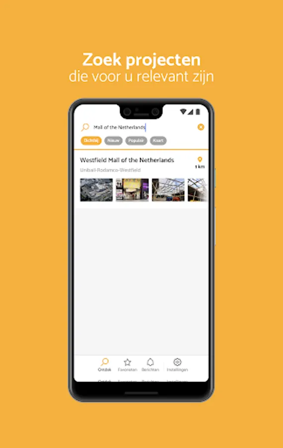 In the BouwApp you can search for construction projects and construction companies that you are interested in. This can be done on a map, but also by entering search criteria, for example searching by name, place or construction company.
